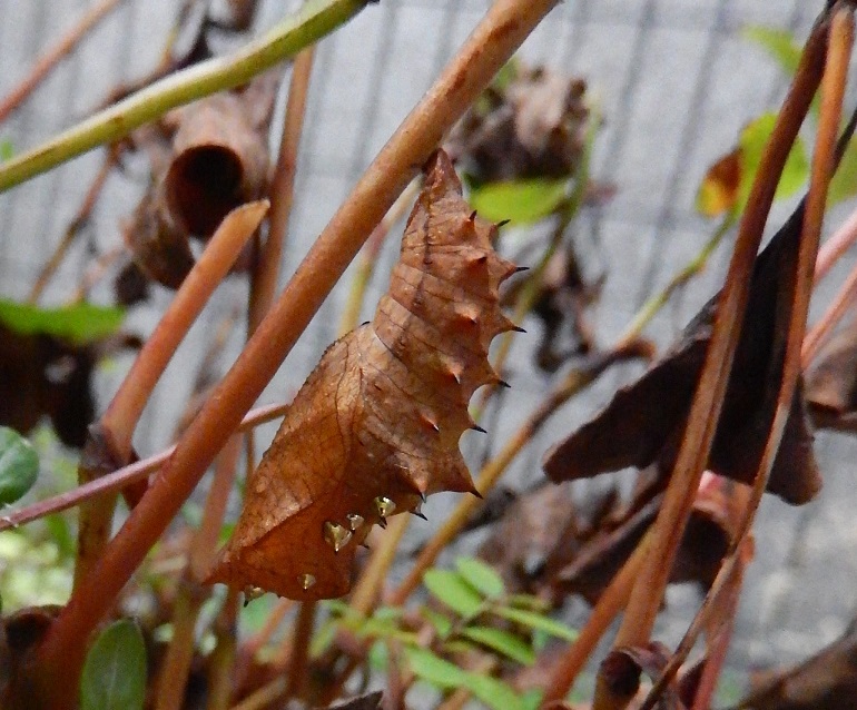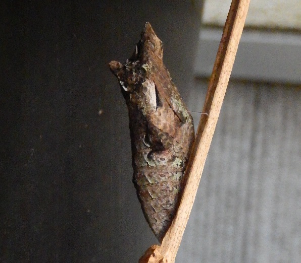 隣の鉢の枯れたドクダミの茎で蛹になりました。水撒きの時に水があたると体を激しく震わせます。