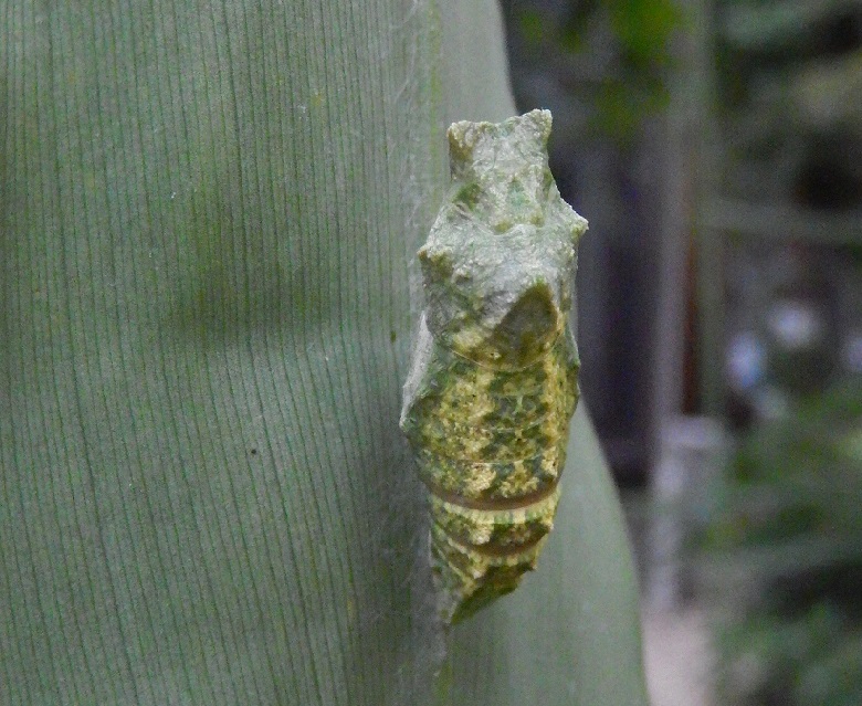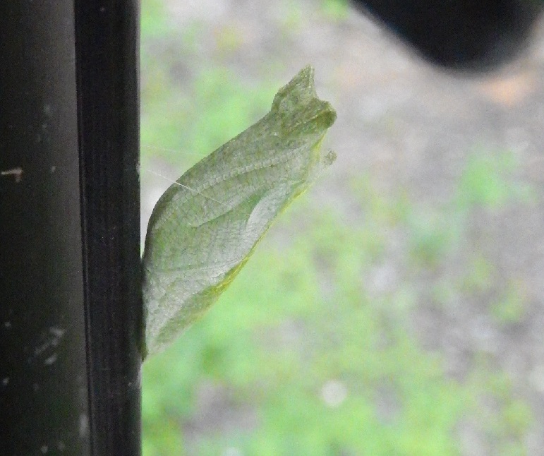 別の蛹です。塀の向こう(蛹の下方向)には緑の草が生えていました。