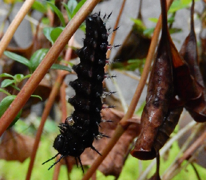 幼虫が蛹になる前の段階を前蛹と言います。ツマグロヒョウモンの幼虫は頭を下にして尾部でぶらさがります。