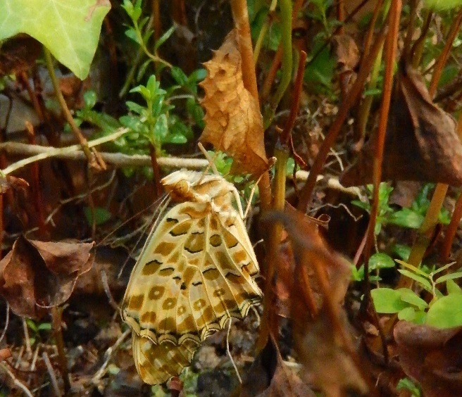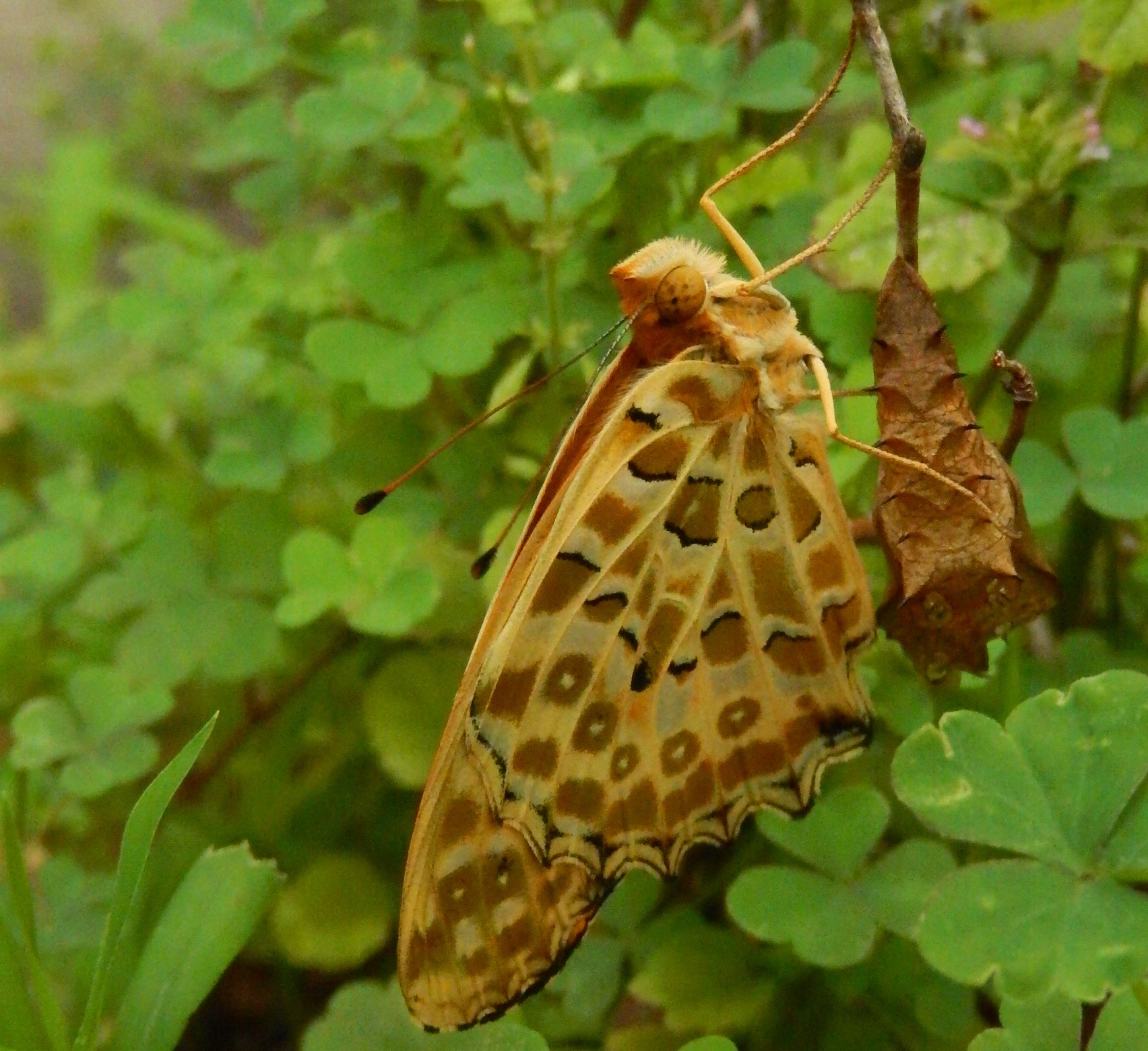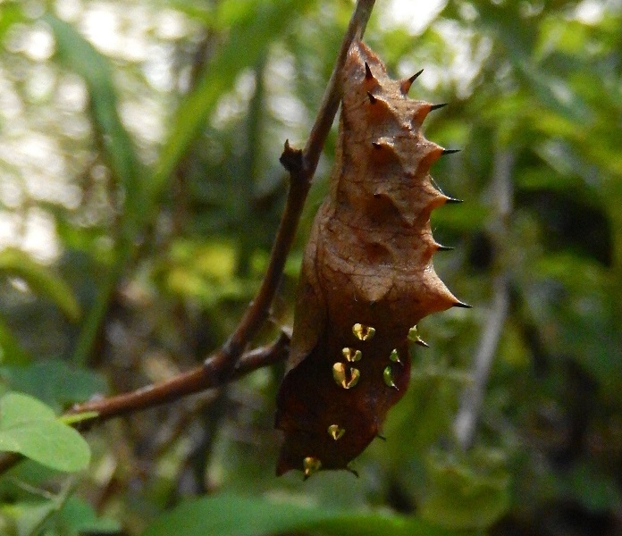 蛹はどうでしょうか。私は今回初めてツマグロヒョウモンの蛹に褐色系があることを認識しました。ネットで調べてみると,別に珍しいことでないことがわかります。今までの私の認識では,ツマグロヒョウモンの蛹は黒で,背側にある銀色に光る突起が強く印象に残っていました。アゲハでは,環境要因と蛹の色の関係がよく調べられているのは耳にしていました。ツマグロヒョウモンではどうだろうかと思い,調べてみましたが納得がいくものは見つけられませんでした。しかし,写真でもわかるように蛹は見事に環境に溶け込んでいます。何か蛹化の時に環境認識システムがありそうですね。野外で生物を観察する重要性を再認識しました。