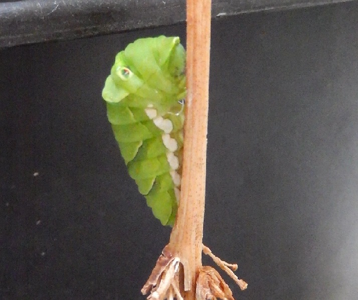 次は幼虫です。毛虫そっくりですが,毒はないと言われています。これも擬態の例とされています。毛虫がすべて毒をもっている訳ではありませんが,イラガなどに一度やられた経験のある哺乳類には有効な気がします。