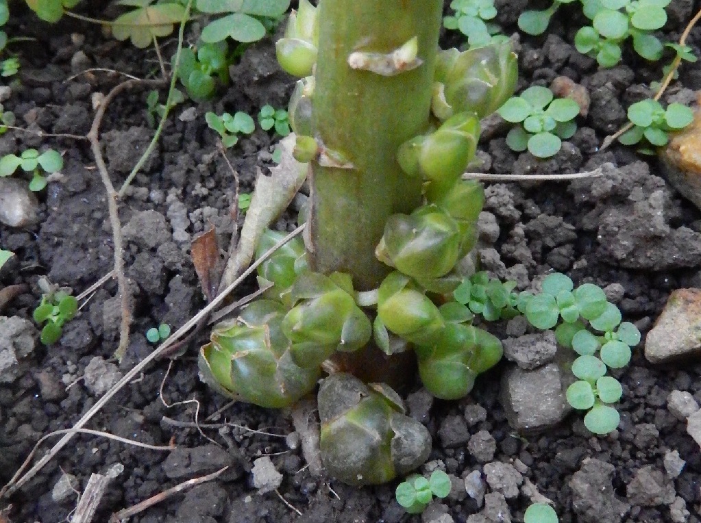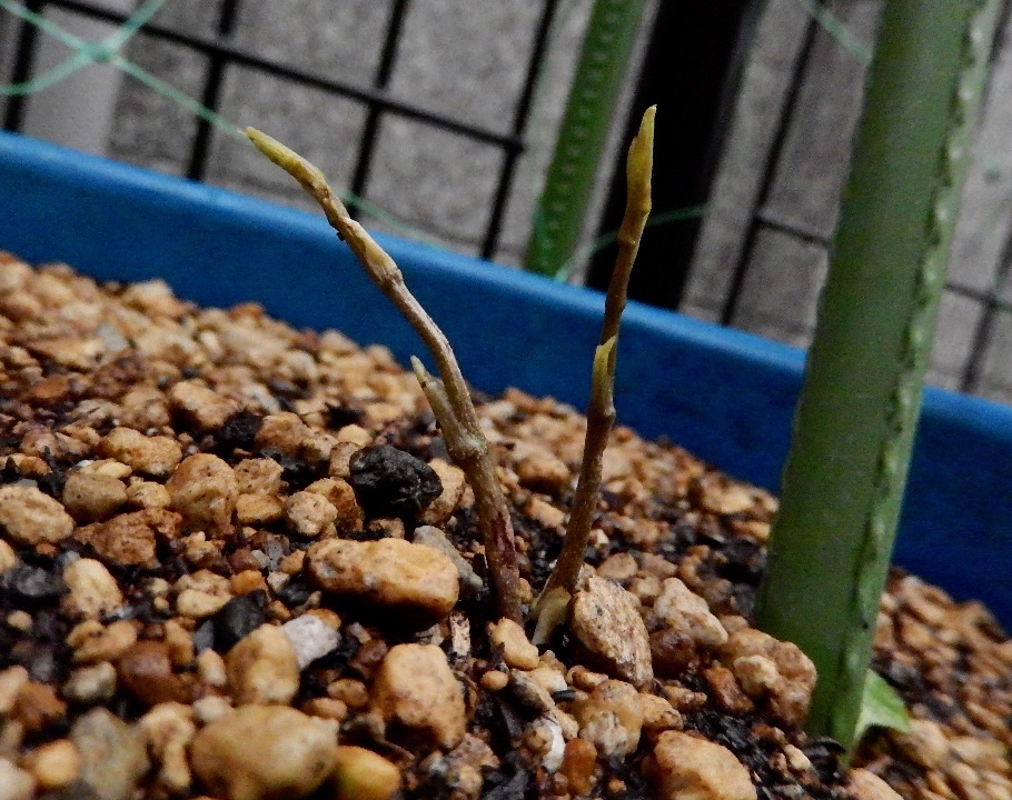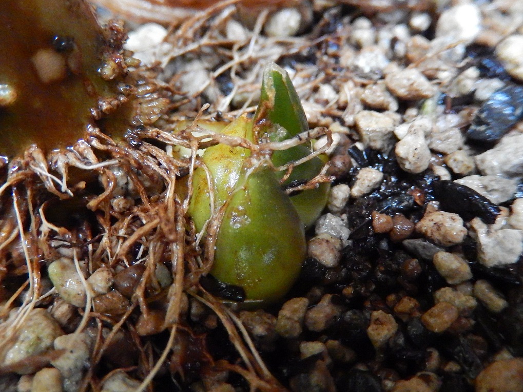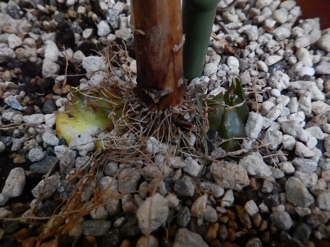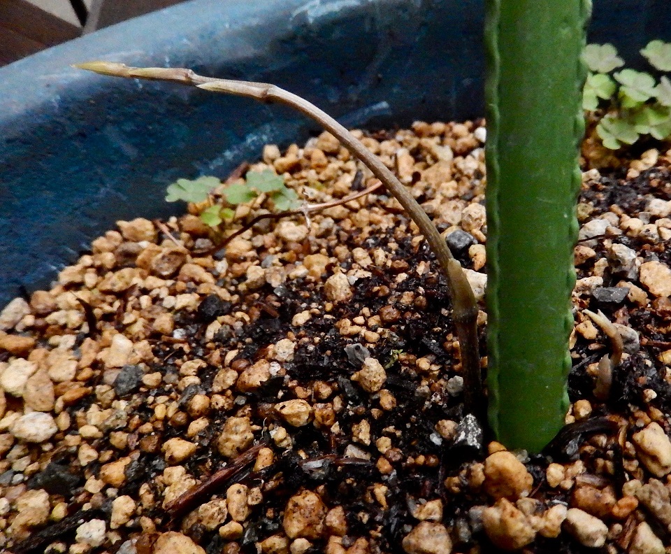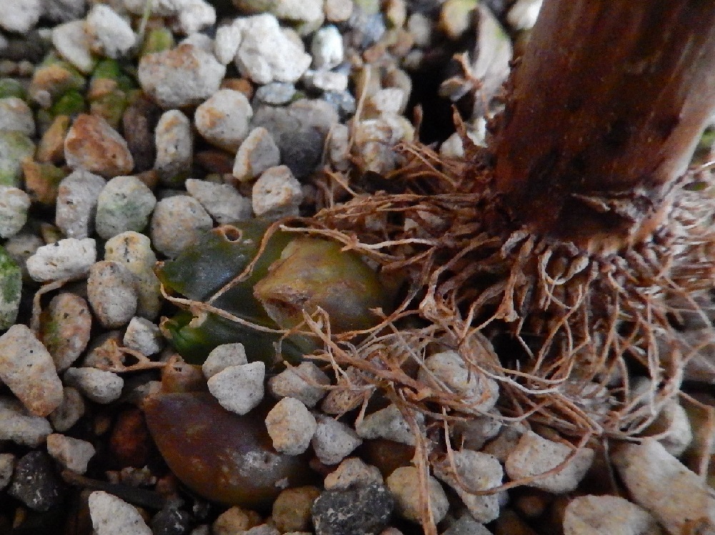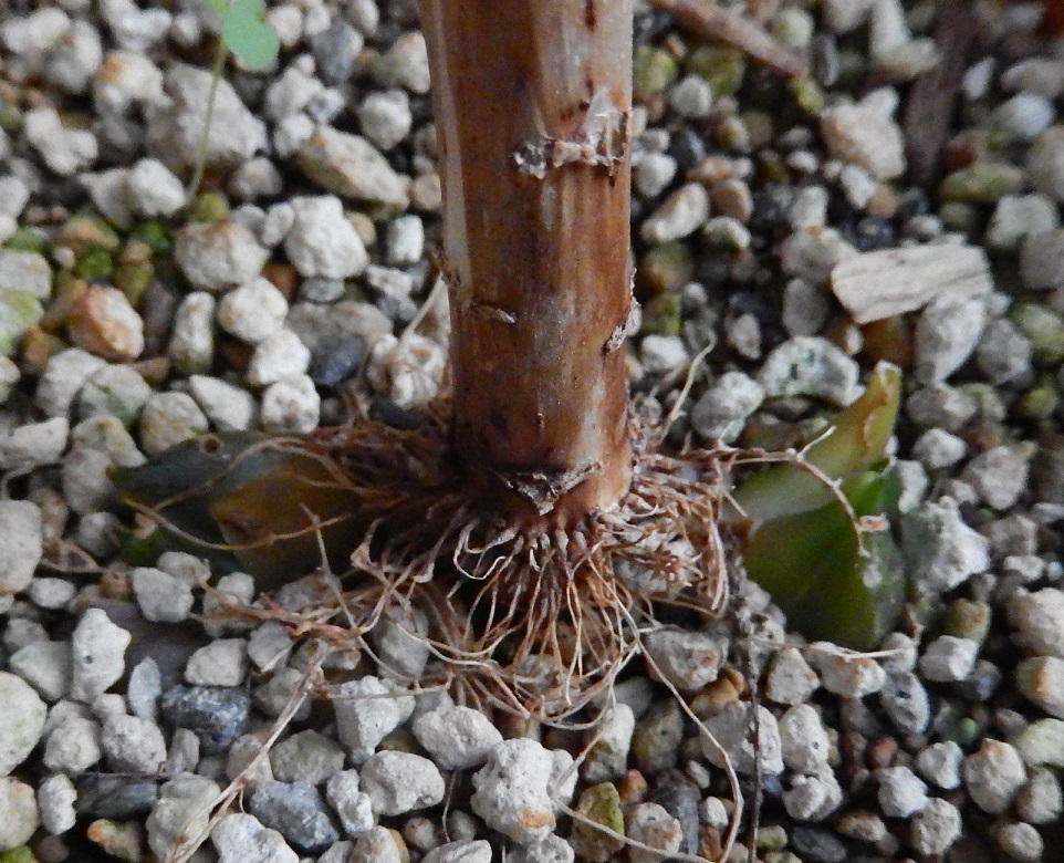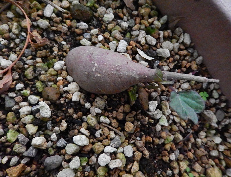 それでは,この脱出劇がどのように進行したか考えてみましょう。植物ですから,この脱出劇は成長運動です。きちんとした連続写真がないので,殆ど推察になります。もちろん,答えは私もわかりません。写真で気にかかるのは,塊根の細長い部分です。元の状態は確認できませんのでわかりませんが,少なくとも地下に埋もれていた部分が成長したことは間違いがありません。地下部分の成長を調べることは困難ですが,このひょろ長いしっぽ構造は容器で栽培中のものにもあり,末端近くから発根していました。意味がありそうですね。