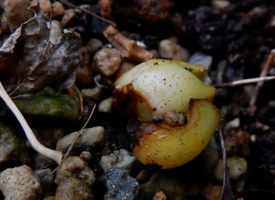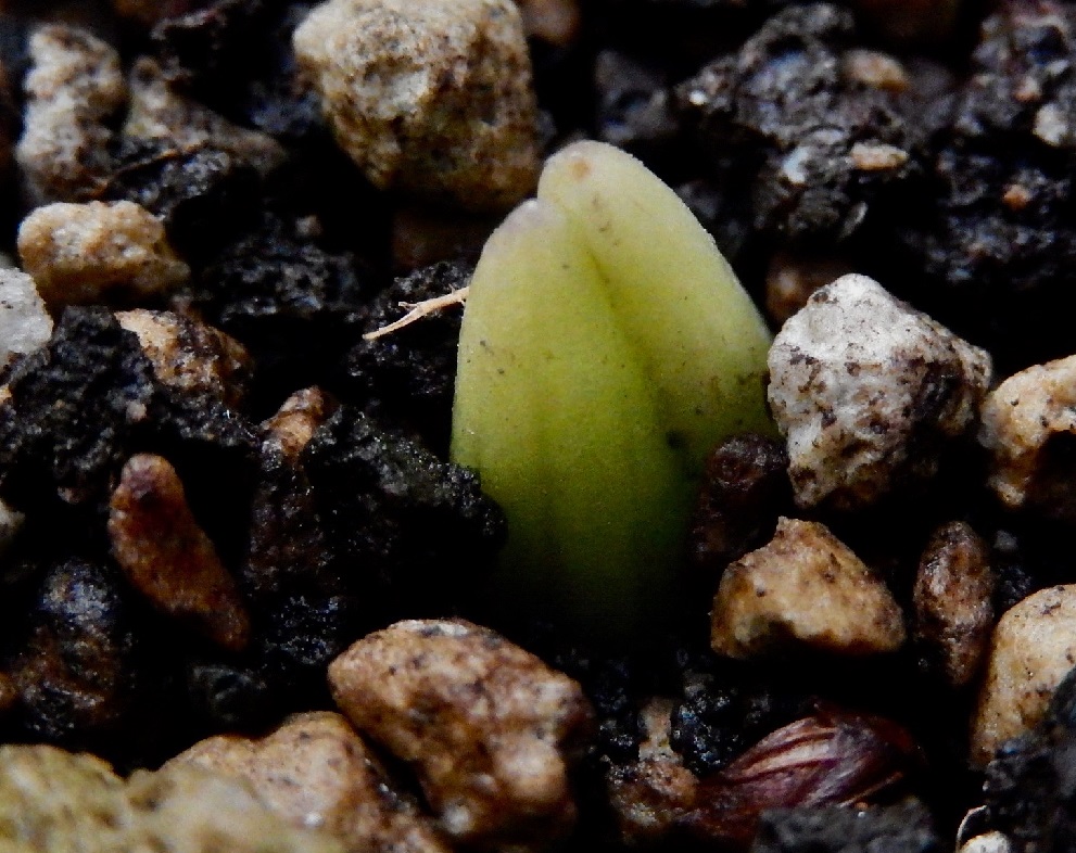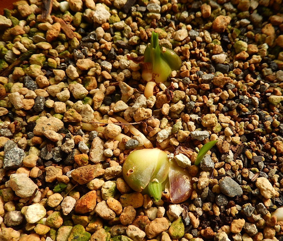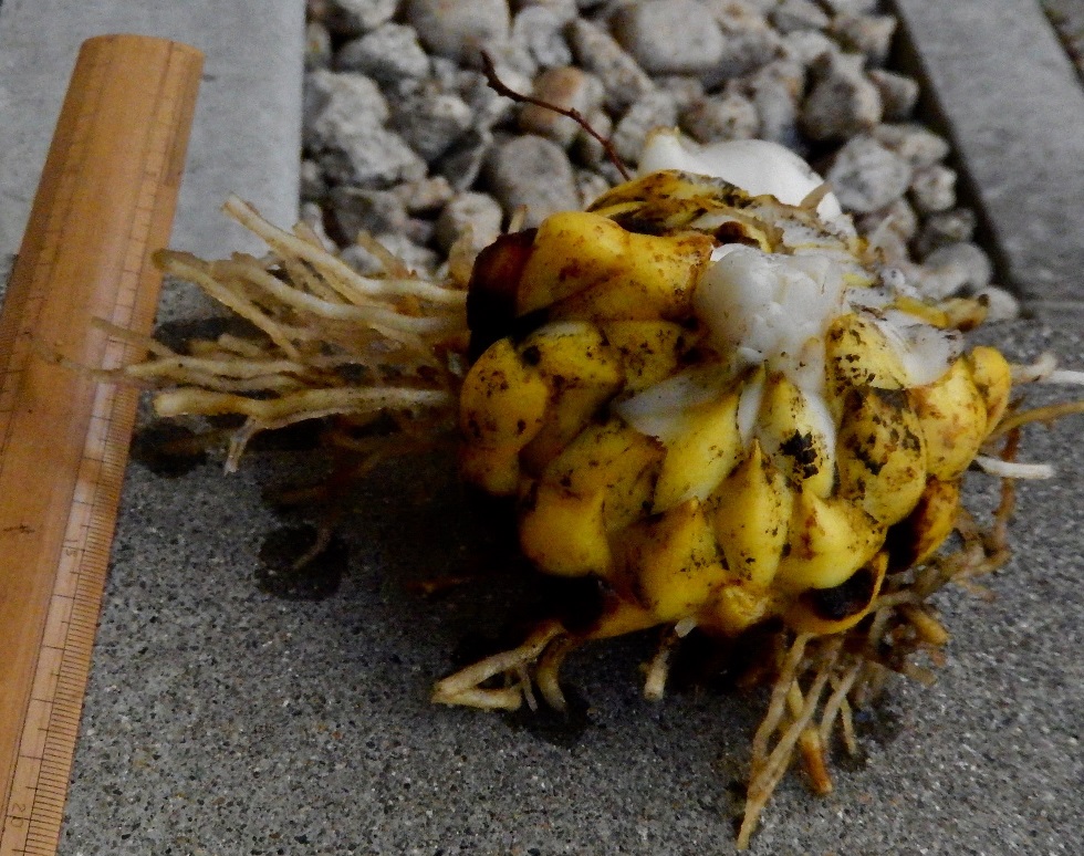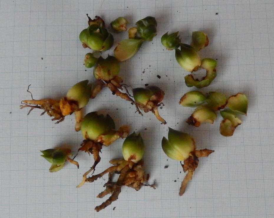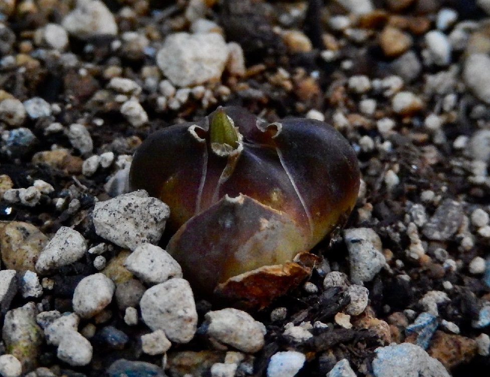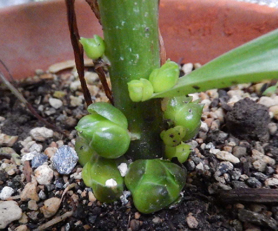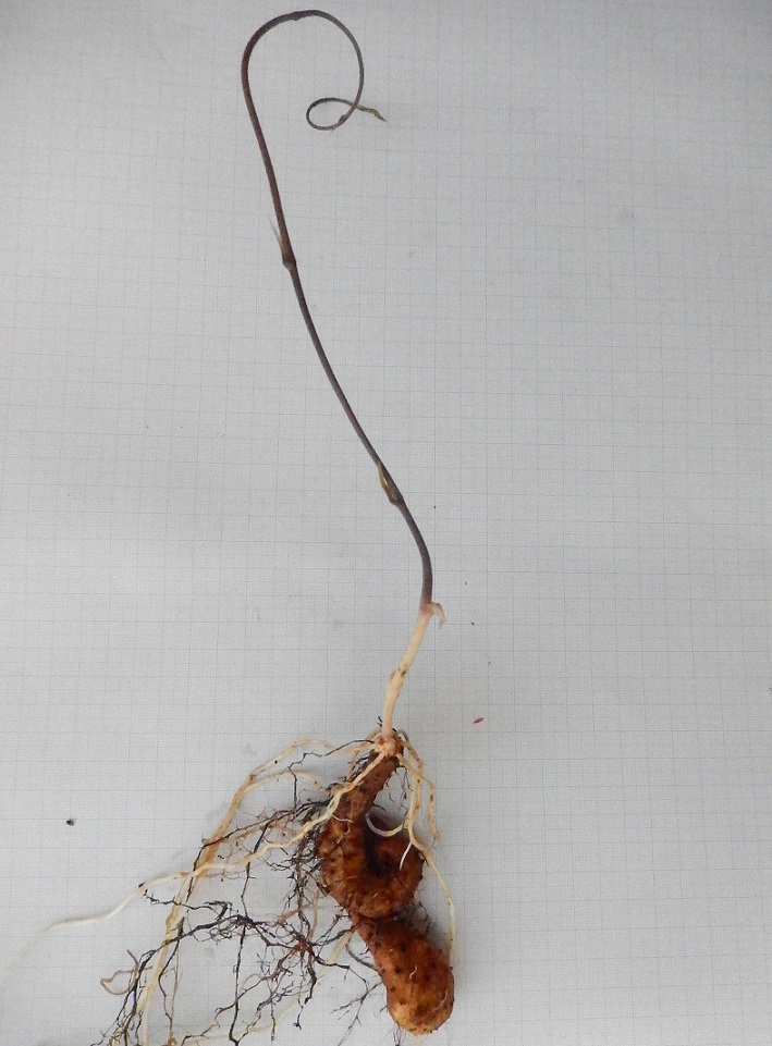 それでは,この脱出劇がどのように進行したか考えてみましょう。植物ですから,この脱出劇は成長運動です。きちんとした連続写真がないので,殆ど推察になります。もちろん,答えは私もわかりません。写真で気にかかるのは,塊根の細長い部分です。元の状態は確認できませんのでわかりませんが,少なくとも地下に埋もれていた部分が成長したことは間違いがありません。地下部分の成長を調べることは困難ですが,このひょろ長いしっぽ構造は容器で栽培中のものにもあり,末端近くから発根していました。意味がありそうですね。