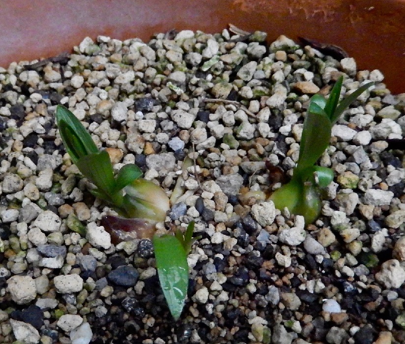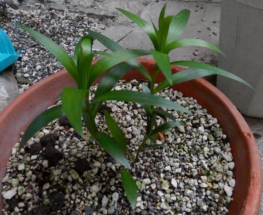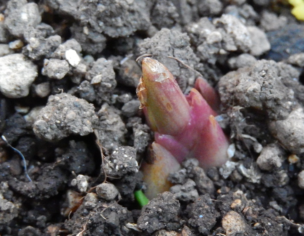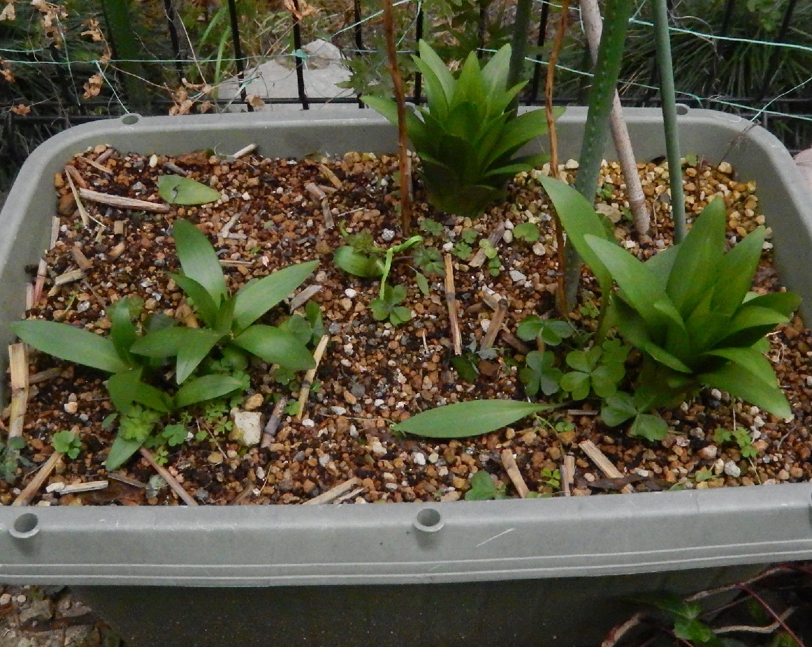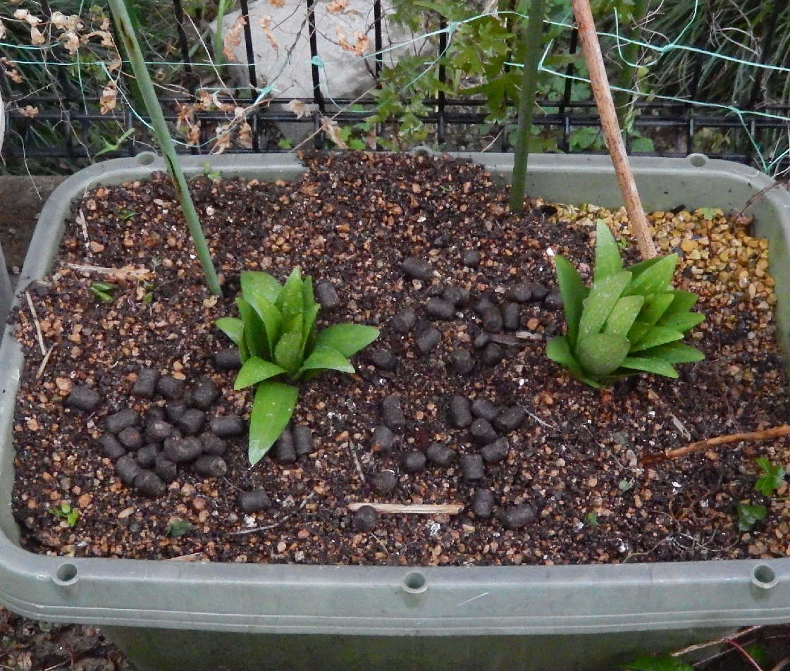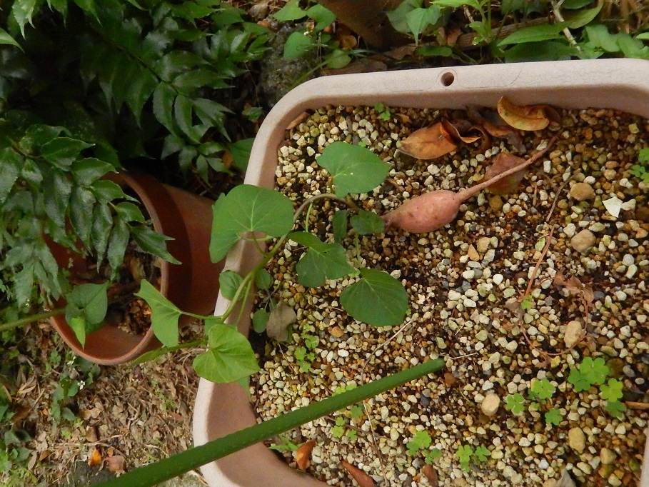 塊根を少し持ちあげ上部に日があたるようにしたところ,やって葉をつけました。プランタのライン奥が南。