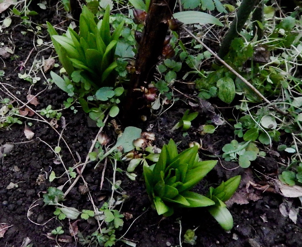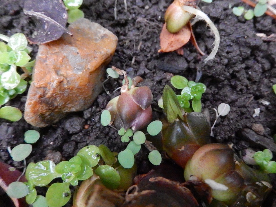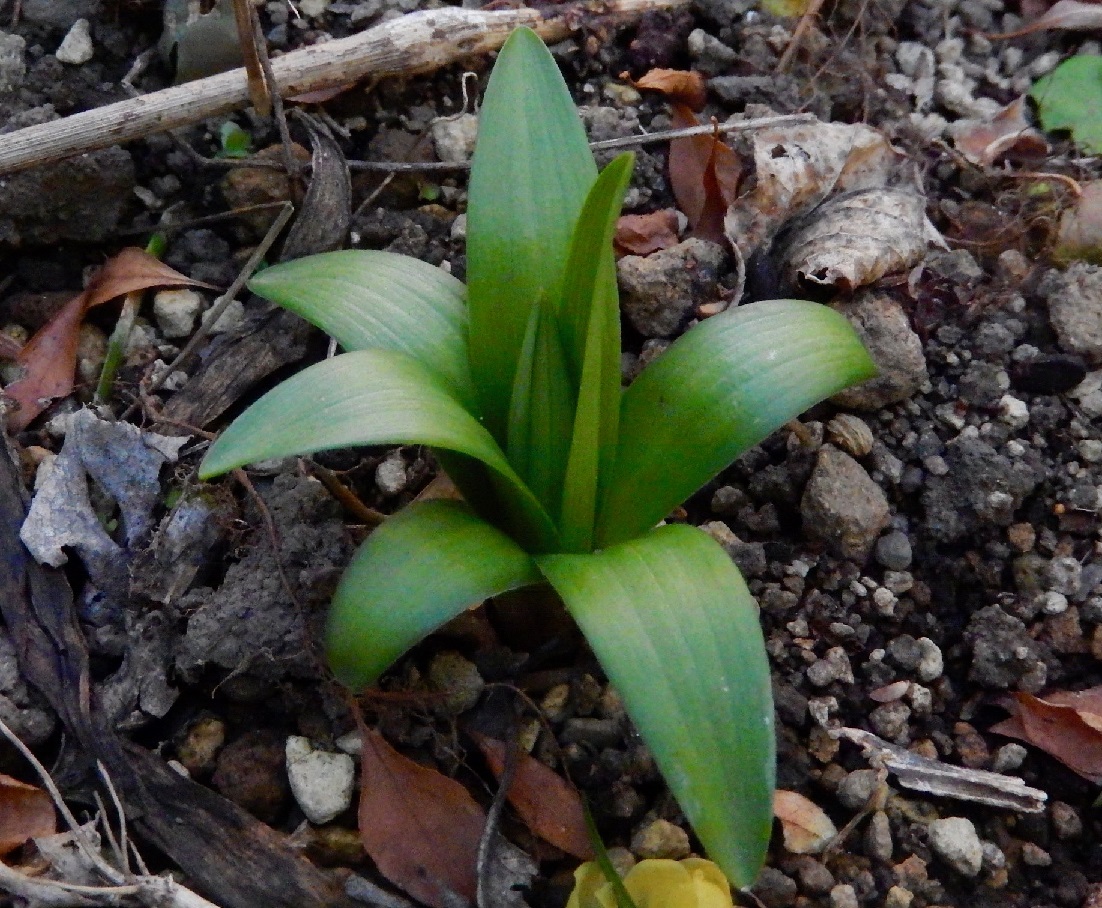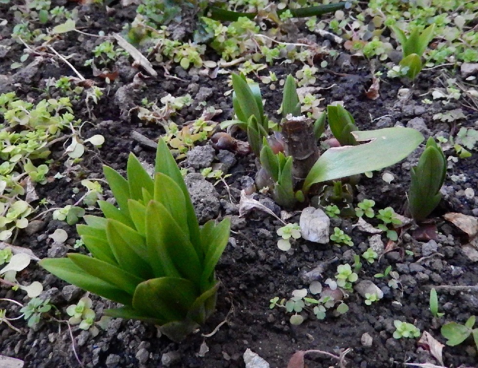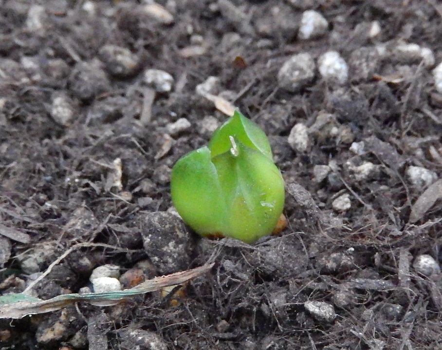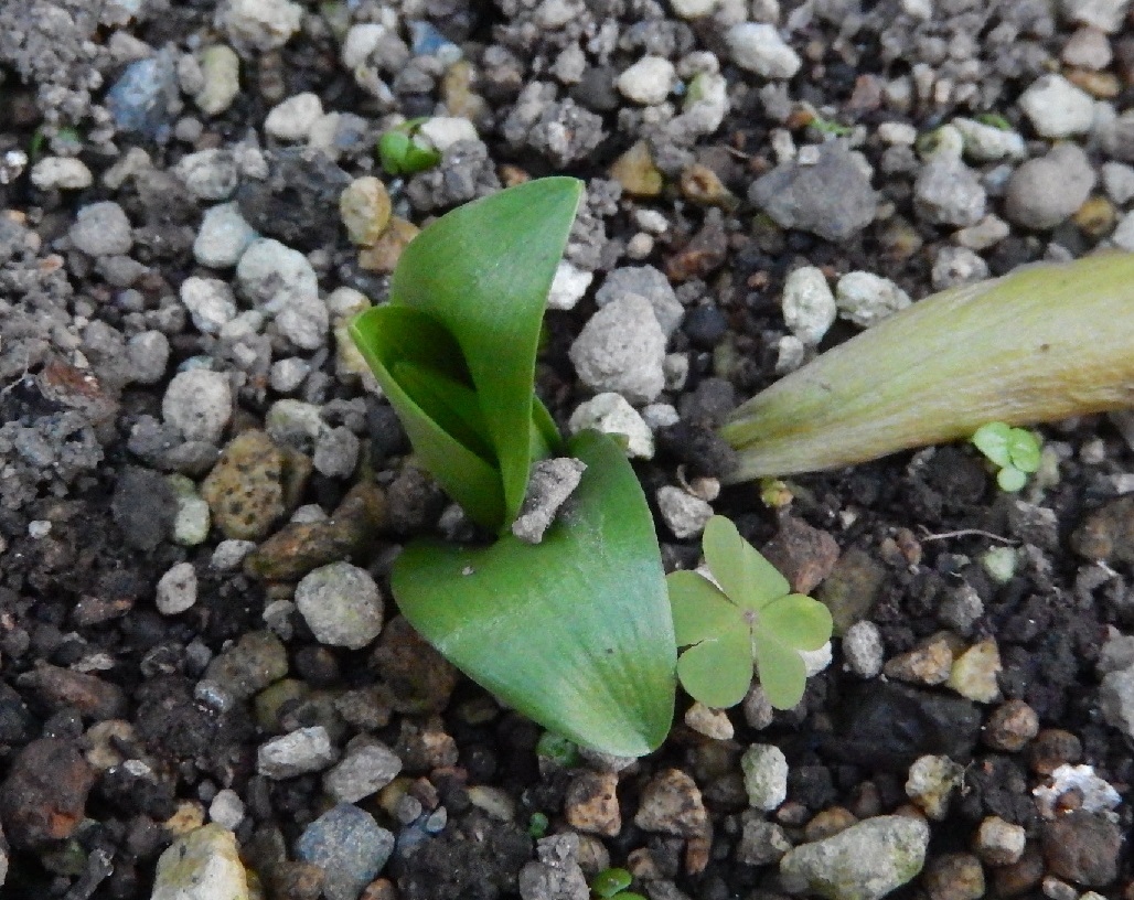 塊根を少し持ちあげ上部に日があたるようにしたところ,やって葉をつけました。プランタのライン奥が南。