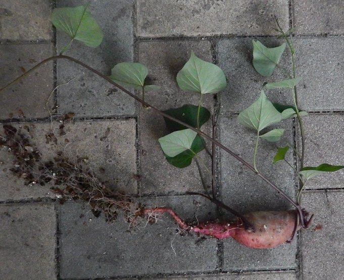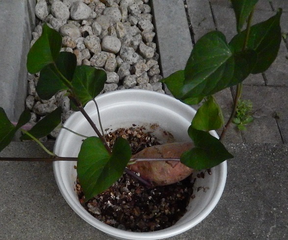 我が家では昨年(2019年)よりサツマイモを栽培しています。これは,発芽実験に使用したものを庭の片隅及びプランタに植えたのが始まりです。十分な畑は作れませんので,芋には期待できませんが,私は俗にいう芋の茎(葉柄)が大好きなのでそれで十分です。畑のような場所は掘り返して芋を取り出せますが,その他の部分では見落としもあります。案の定,プランタの中に子芋が2個残っていました。今年はこれらを使用すればいいと思いながら観察を続けていましたが,一向に発芽してきませんでした。市場には,サツマイモの蔓が出回ってそれなりの時間が経っています。友人に相談すると,サツマイモは南の方の作物なのである程度以上の温度が必要で,今市場に出ているのは温度調節して発芽させたものだとのことでした。また,芋が日光に当たる必要があるかもしれないとのことでした。そこで,大きい方の芋を掘り出して容器に入れて窓際に置き,もう1つは芋の上部に光が当たるようにしてプランタの中にそのままにしました。初めは気にかけていましたが,中々発芽しないなと思っていたら,プランタの中の芋から葉が出ているのに気づき写真を撮りました。写真は概ね奥が南側です。観察目的ではなかったので最初の状態の写真はありません。今改めて写真を見直すと,随分地面から飛び出しています。その時は全く気がつかなかったのですが,すでに脱出劇が始まっていたようです。こんなに飛び出した芋を収穫のときに見逃すはずはないでしょう。更に推測すると,芋がまだプランタの中に残っていることに気がついた時には,脱出劇の序章が始まっていたように思われます。
