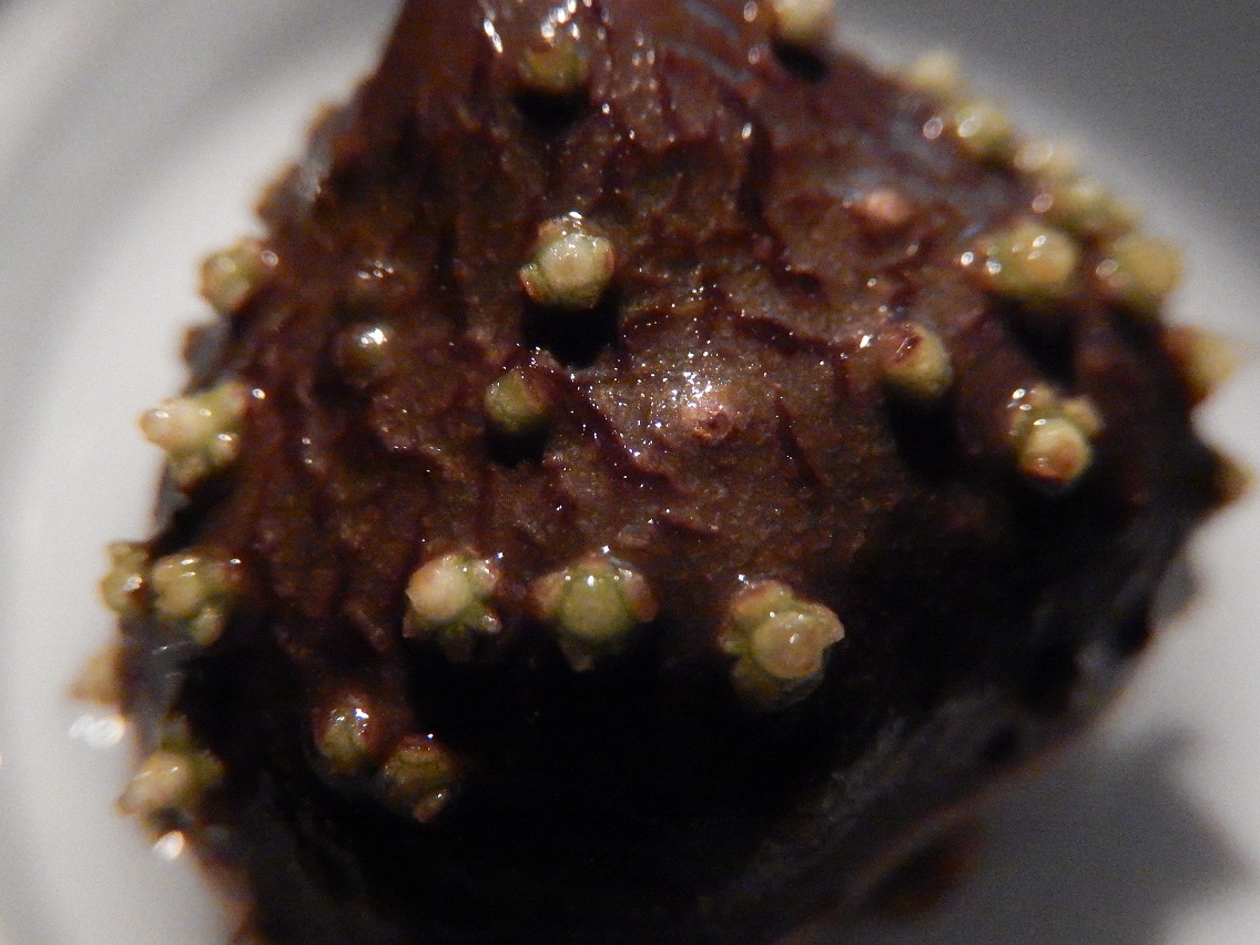 上の雄の蛹です。写真の下の部分に金属光沢の刺のような突起があります。写真では金色のように見えます。