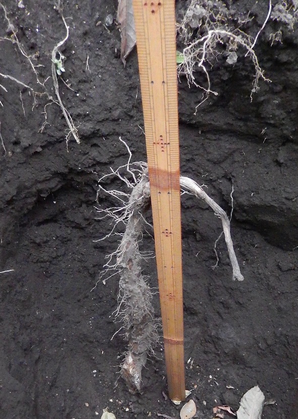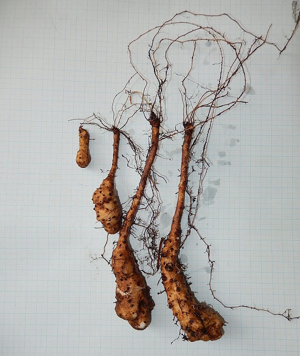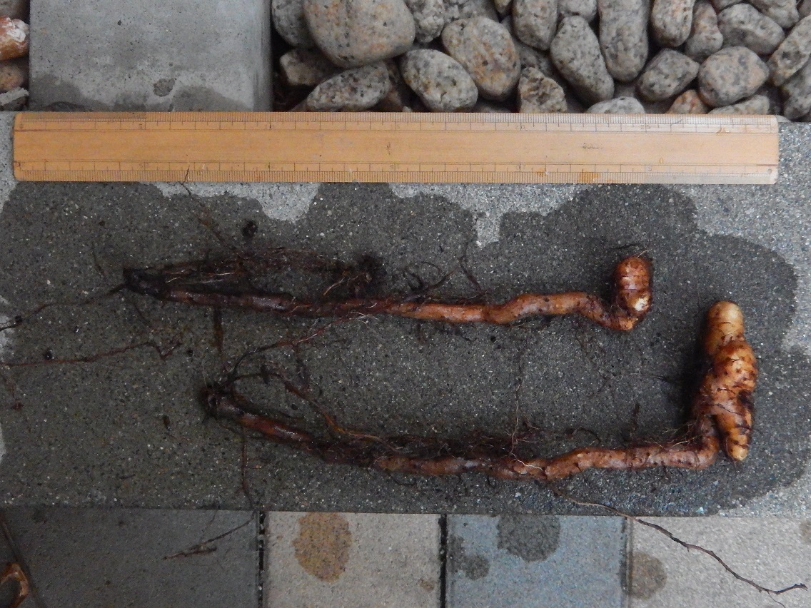 左のサツマイモを取り出して地下部の状態を調べました。根は地下部にある細い部分の末端付近に形成されていました。