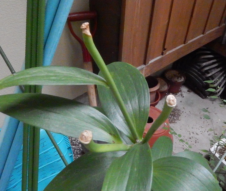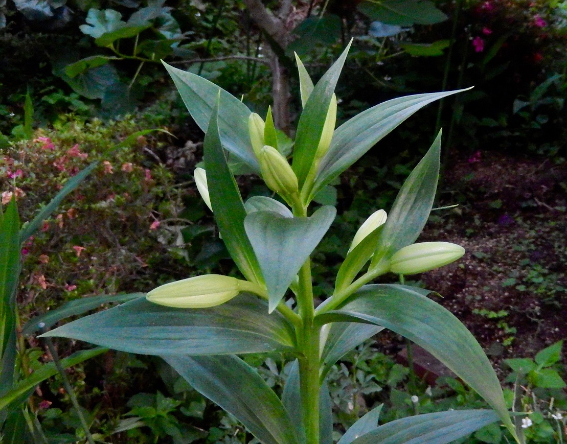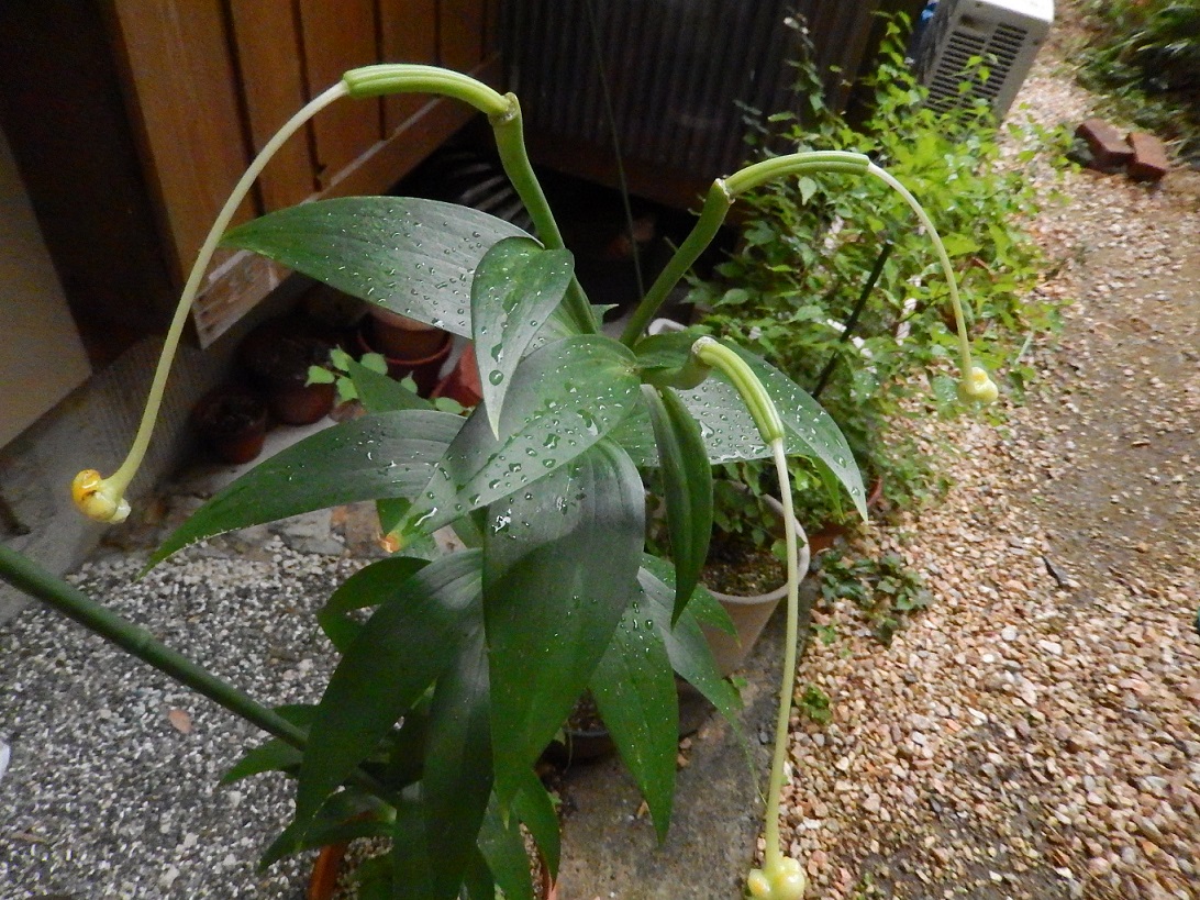 まず,疑問1については,栽培しているテッポウユリで栄養状態の良好な個体に普通に観察されたことです。福岡県南部でテッポウユリを栽培してされている方からも同様な情報が得られています。これは,周辺の地域で流通している球根に見られる現象のようです。疑問1について,要は,「流通している品種」の問題か,それとも,「自生地でも同様な現象があるのか?」を確認してみる必要がありそうです。
