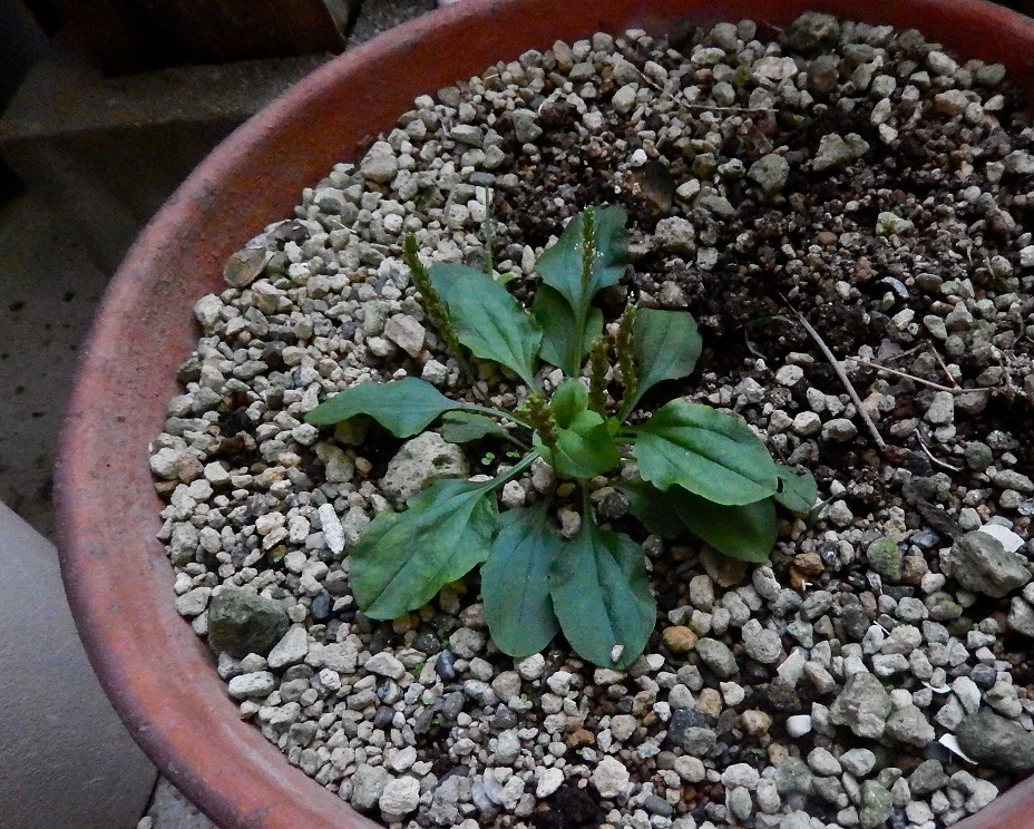 種子を母体から切り離すことを種子散布と呼び,その方法を散布様式と呼びます。すべてのオオバコの種子は,母体から切り離されるときは,概ね重力散布です。多少は風の力も手伝ってくれるでしょう。その後はわかりませんが,一部の種子は,土とともに動物の足などに付着して移動することもあるでしょう。写真の植木鉢に生えてしまった個体は,土とともに移動してきた可能性が強いと思います。