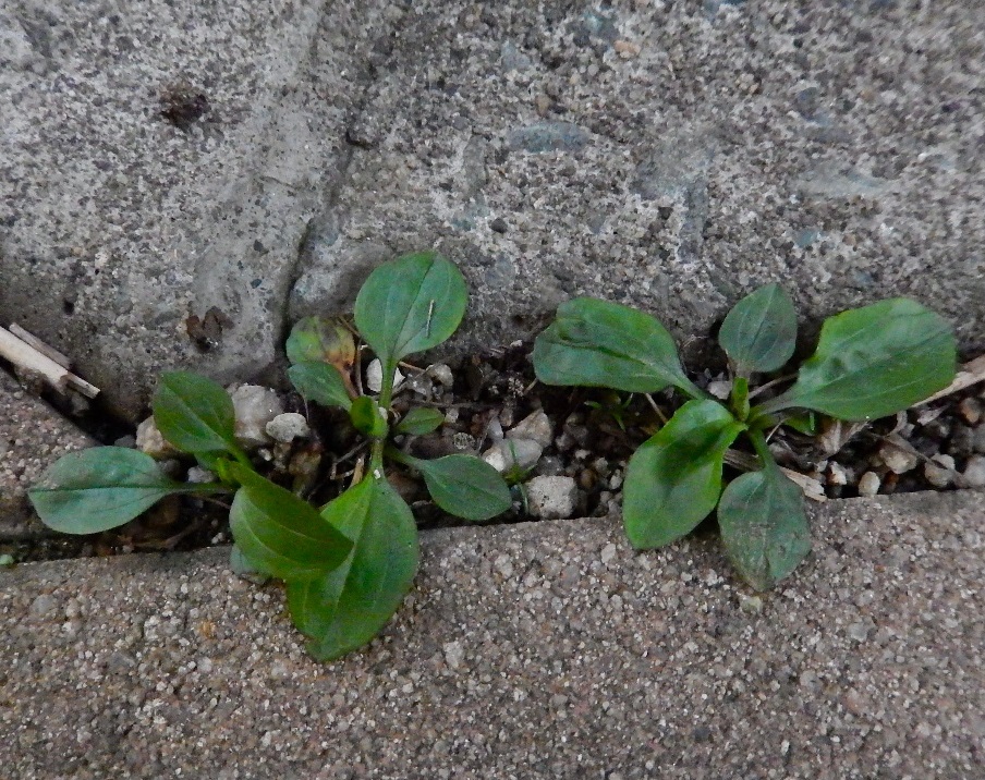 どれ程踏まれ強いかを試してみました。2個体を毎日熱心に繰り返し踏みつけてみました。写真の個体は,1週間ももたずにどこかへ消えてしまいました。レンガの隙間から顔を出している個体は1週間以上も耐えましたので,私の方が根をあげました。オオバコの成長点(頂端分裂組織)は低い位置にあり,葉も踏まれ強いようです。しかし,成長点を直接繰り返し踏まれると,やはり持ち堪えられないようです。