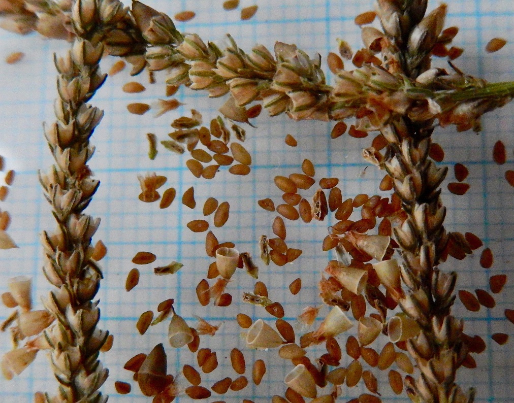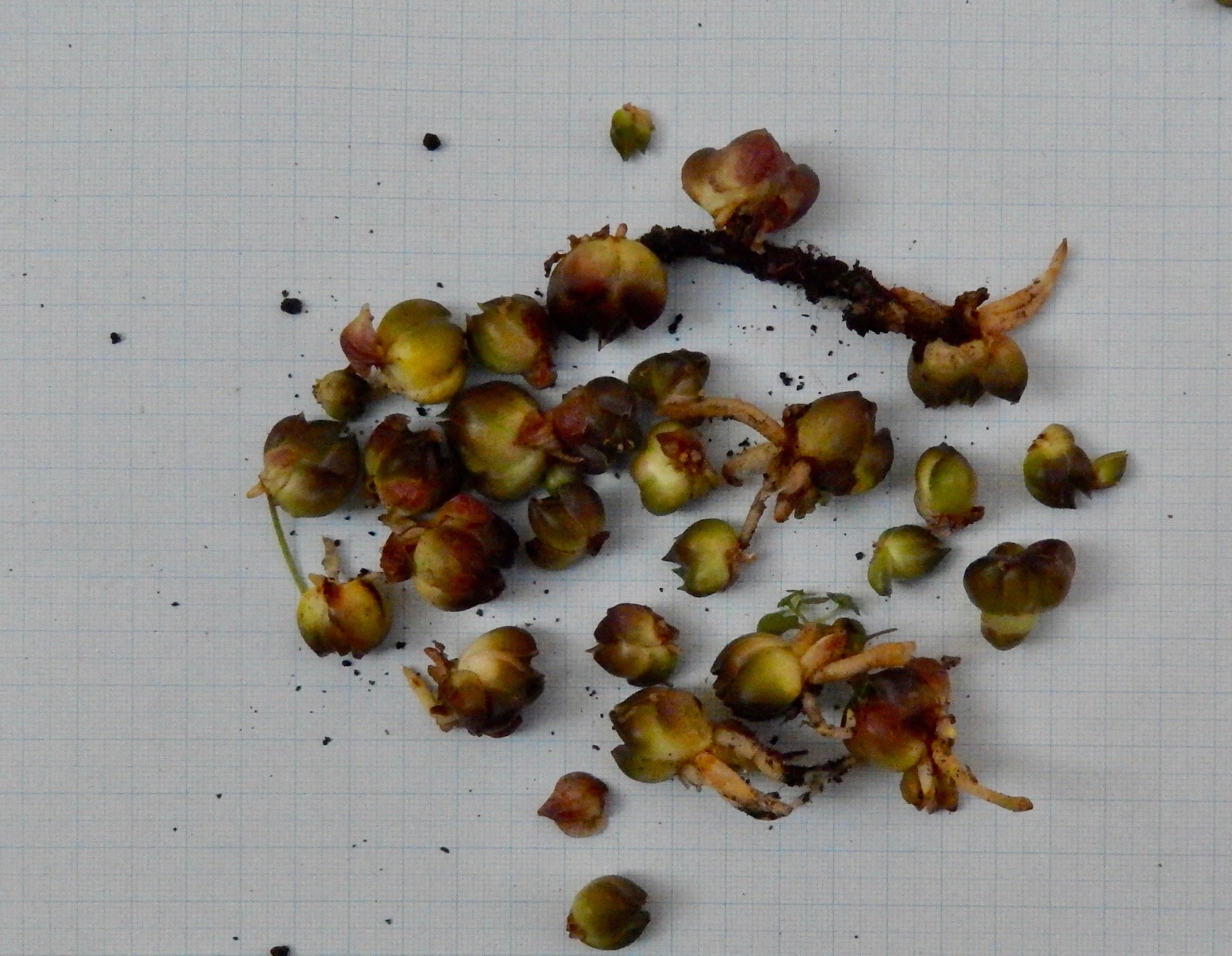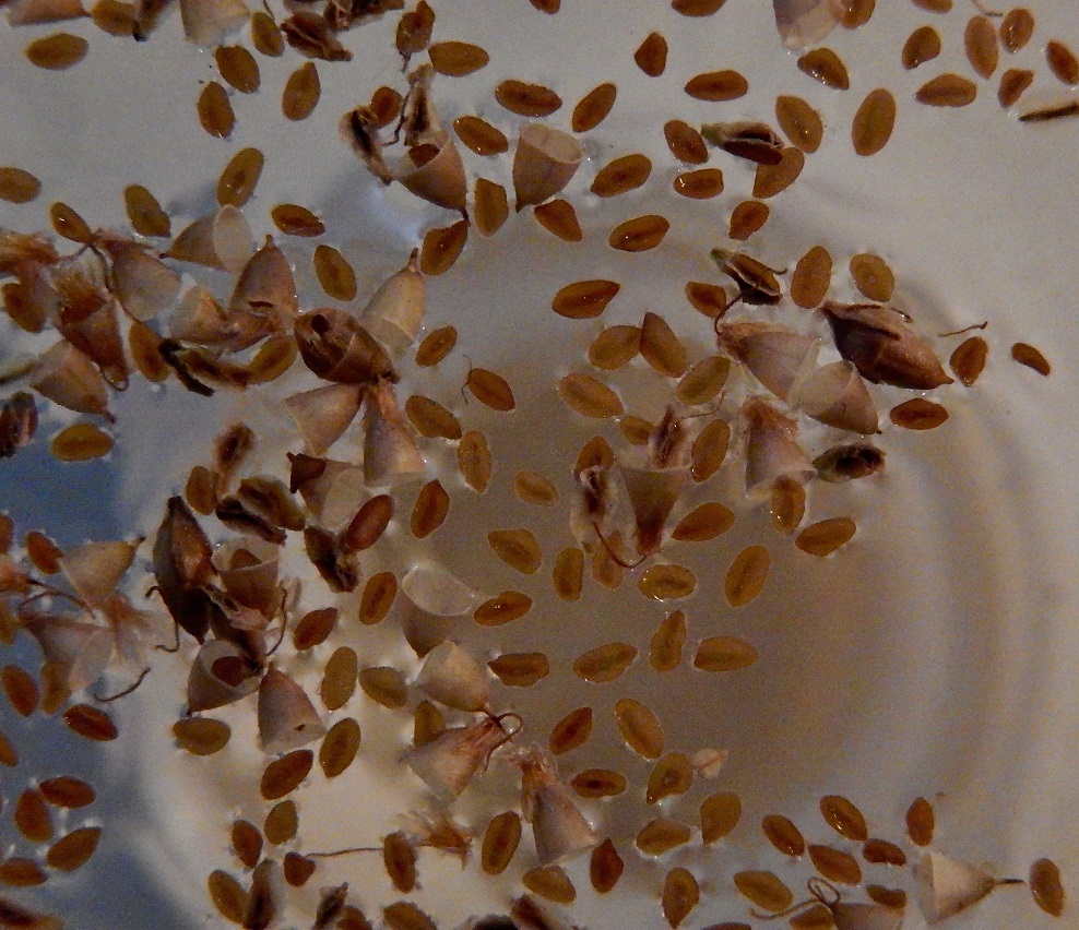 1990年代に野外からトウオオバコを持ち帰ったことがあります。上手く種子まで形成してくれましたので,発芽実験でもやろうかと思い,種子を取り出しました。オオバコの果実は蓋果(がっか)と呼ばれ,果実がほぼ中央から蓋をあけるようにはずれます。そこで,この蓋の部分と種子を分離するために,水につけてみることにしました。結果は,残念なことに殆ど水に浮いてしまいます。おまけに,種子と種子とがべっとりとくっついてしまい,ここで,実験は終了となりました。
