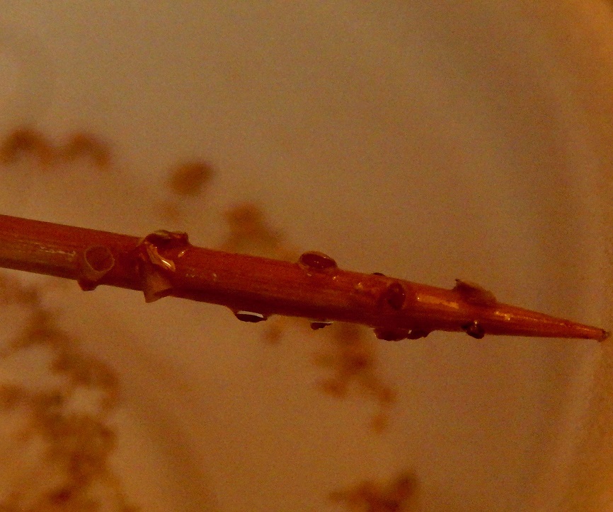 竹串でオオバコの種子をすくった所。水に濡れた種子がくっついてきます。