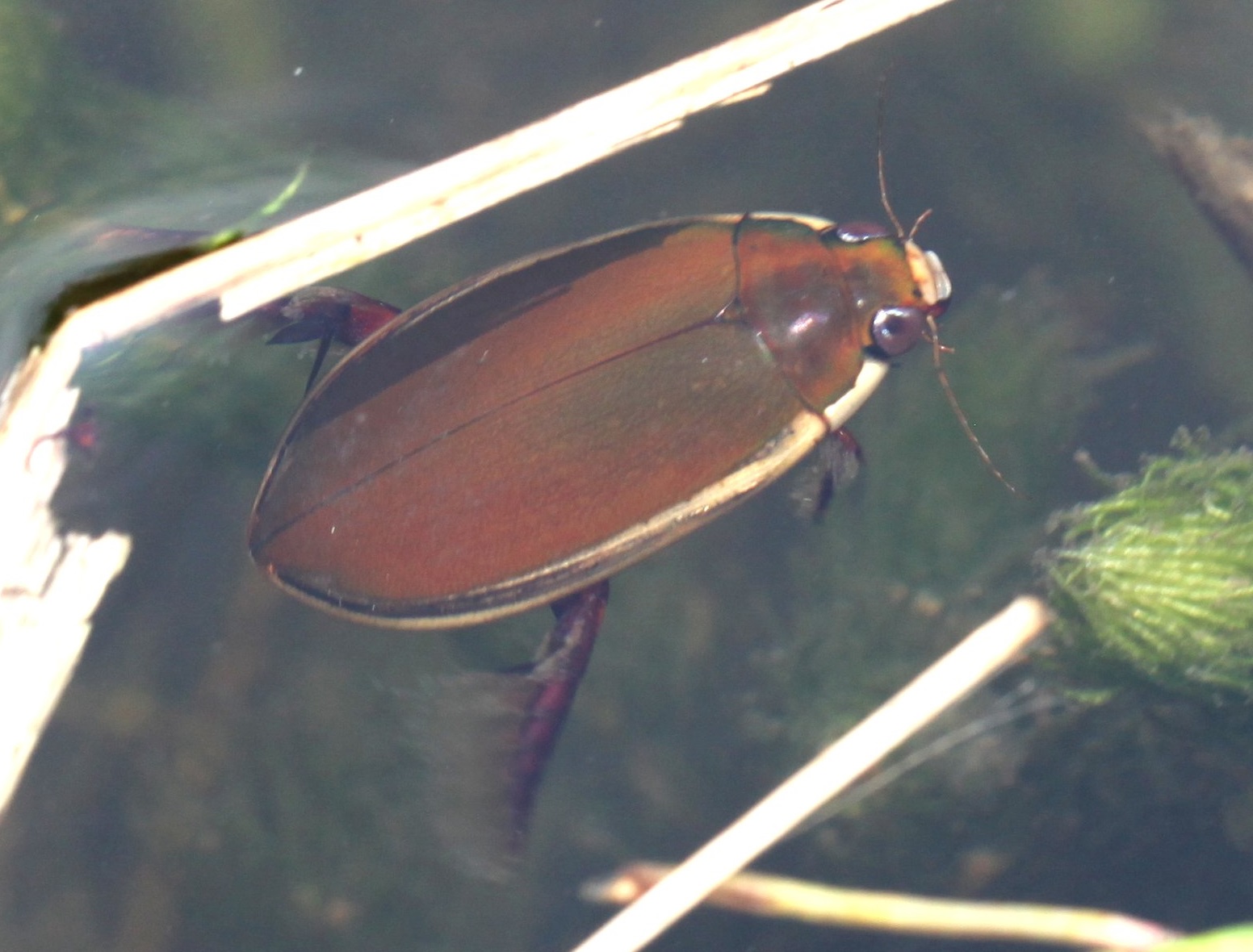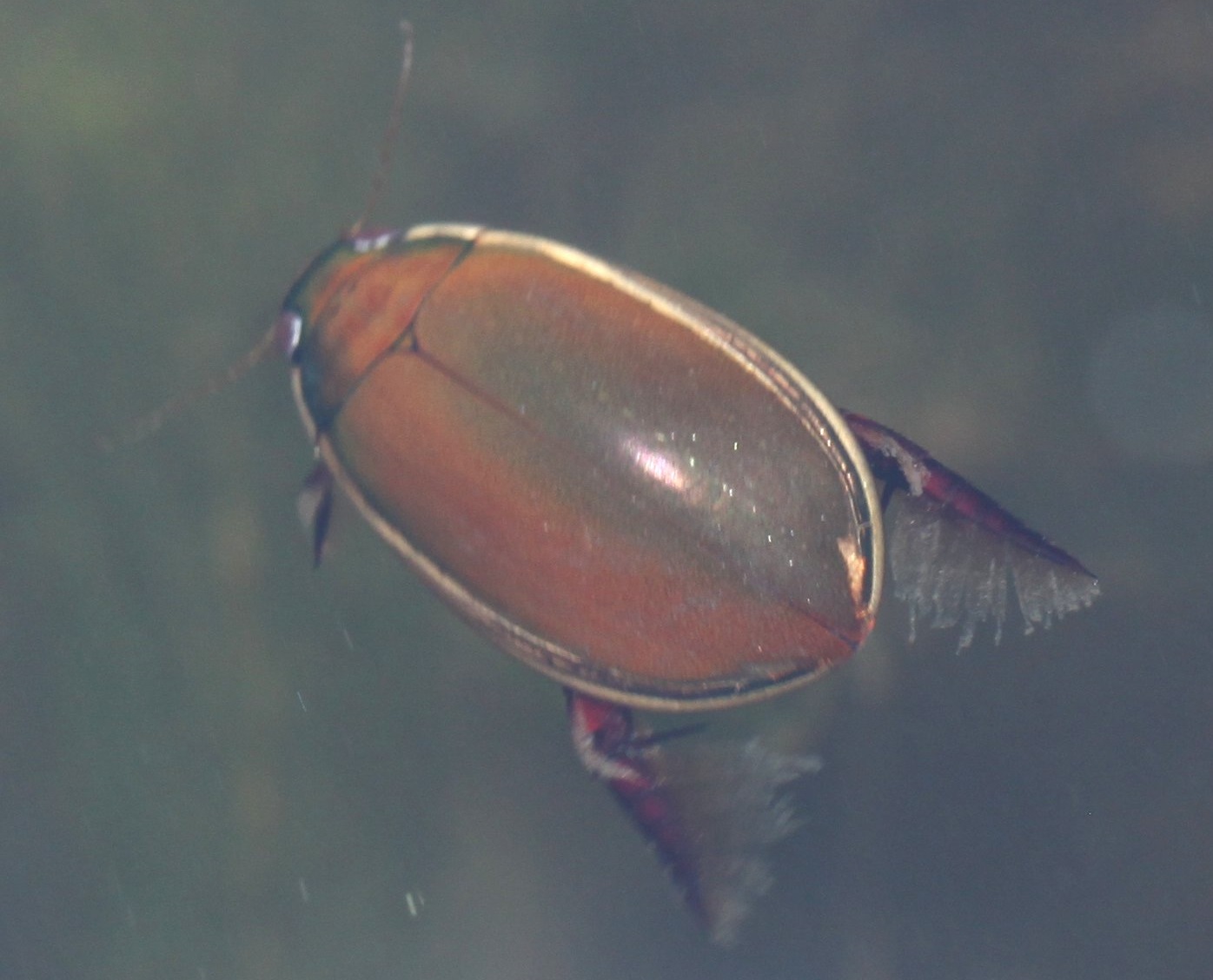 コガタノゲンゴロウはいつから池の住人になったのだろうか。5年前くらい前から姿を現している。水草の陰には独特の形をした幼虫も見ることがある。以前は見ることがなかった小郡市でも急に増加しているのではないだろうか。試しに2018年11月に近所の水路を見て回ったら,やはりいた。網ですくうと元気のいいコガタノゲンゴロウが次々と中に入ってきた。コガタノゲンゴロウは近年の温暖化等の環境変化に適応しやすいのだろうか。