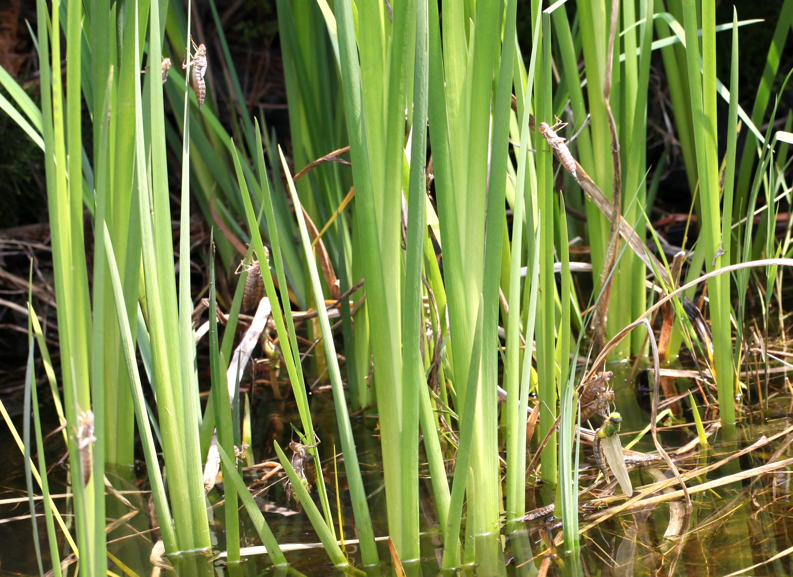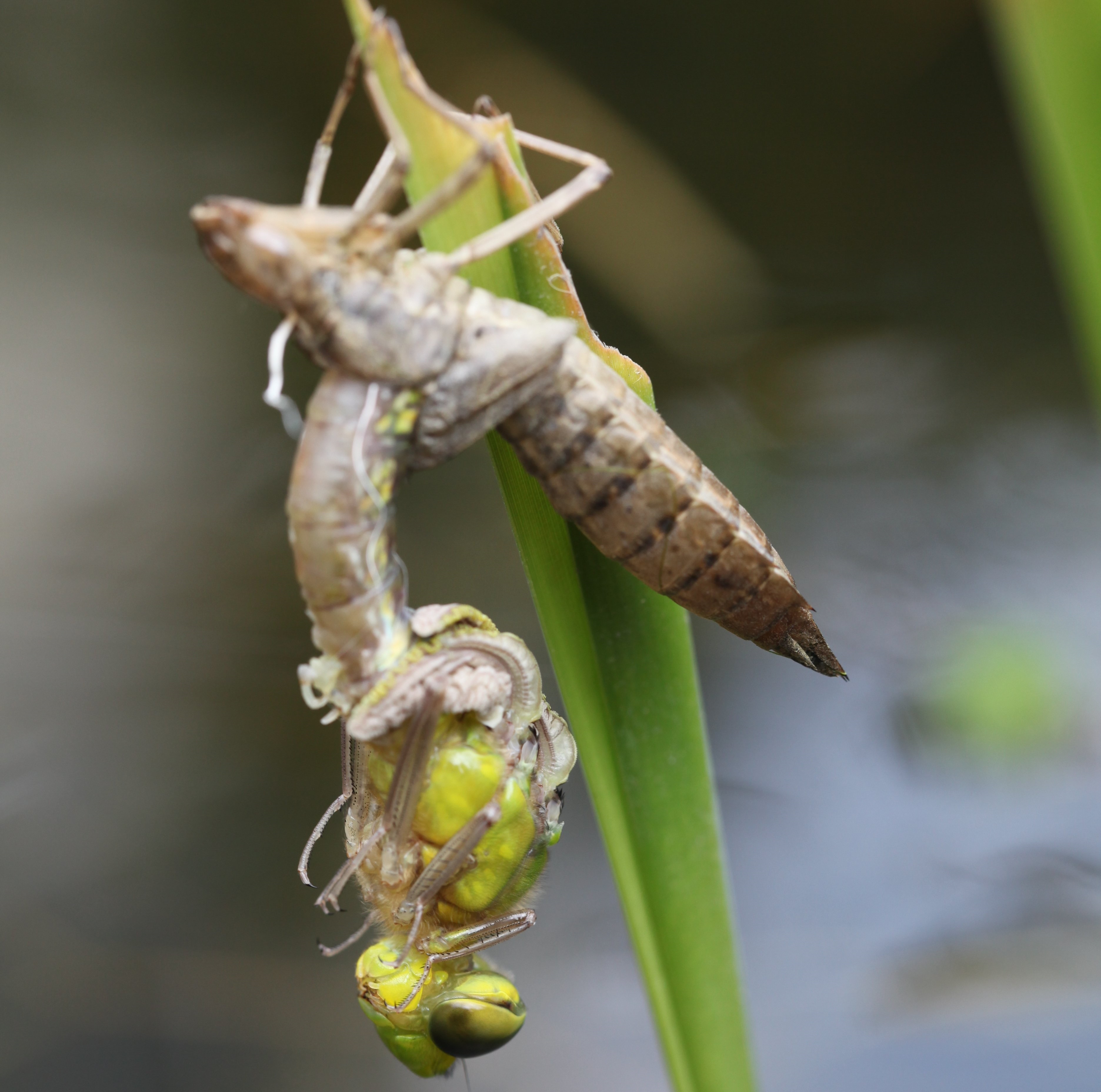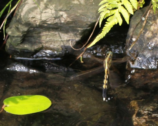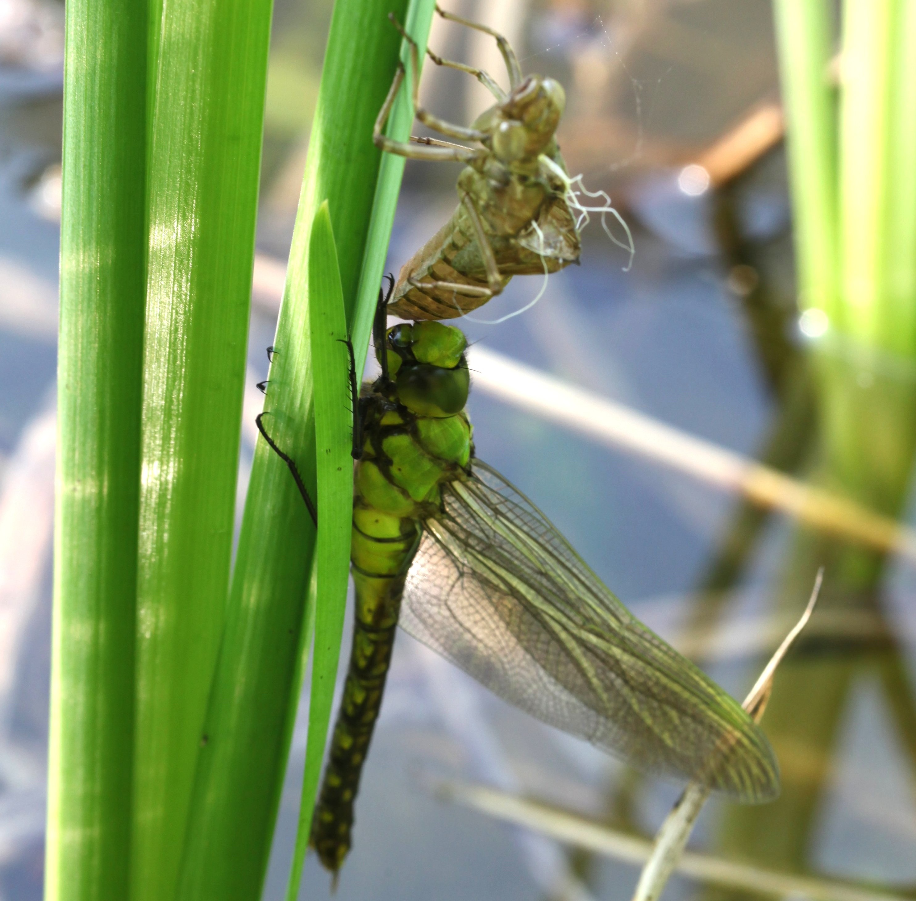 庭の池には様々な生き物が住み着いている。特にギンヤンマのヤゴが多い。毎年4月の晴れた日には一斉に成虫となり飛び立っていく。時には十数匹も羽化している。その横でコガタノゲンゴロウが数匹泳ぎ回っている。アメンボも負けずに泳いでいる。
