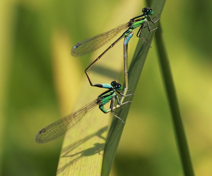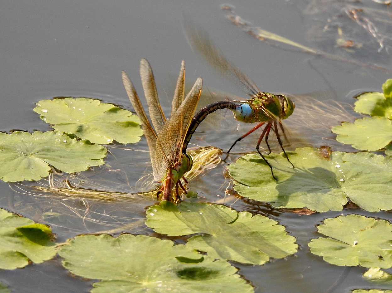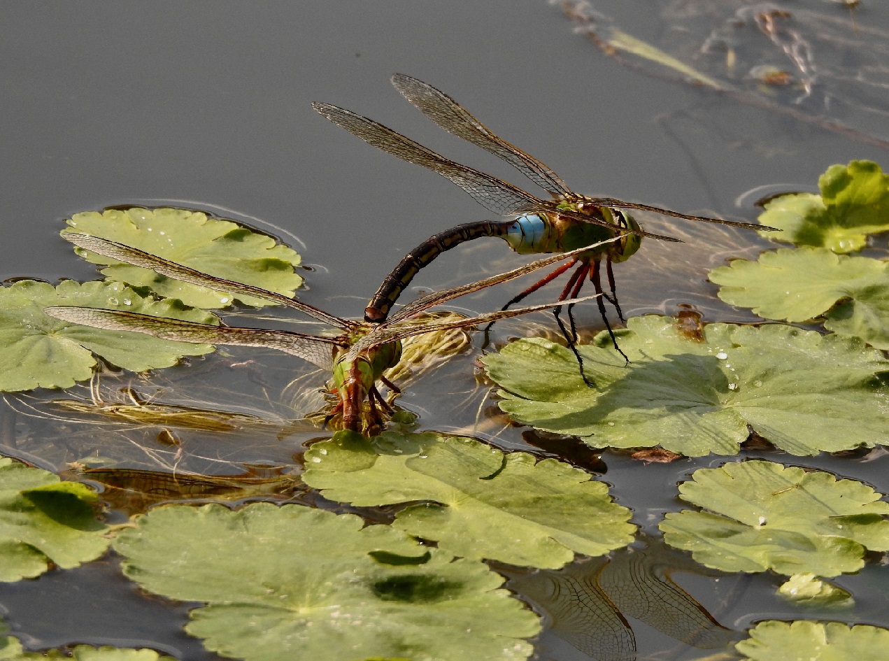 交尾後のカップルがコキヅルの葉で休息している様子。上が雄,下が雌。