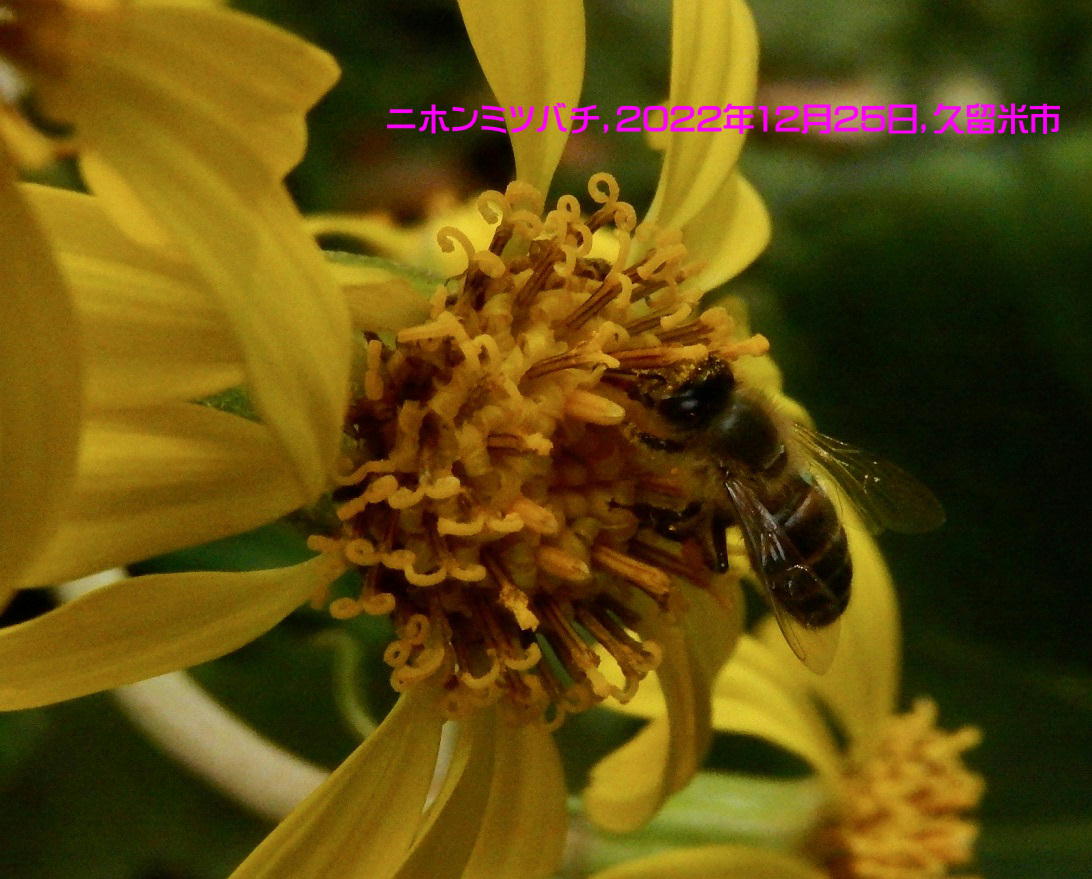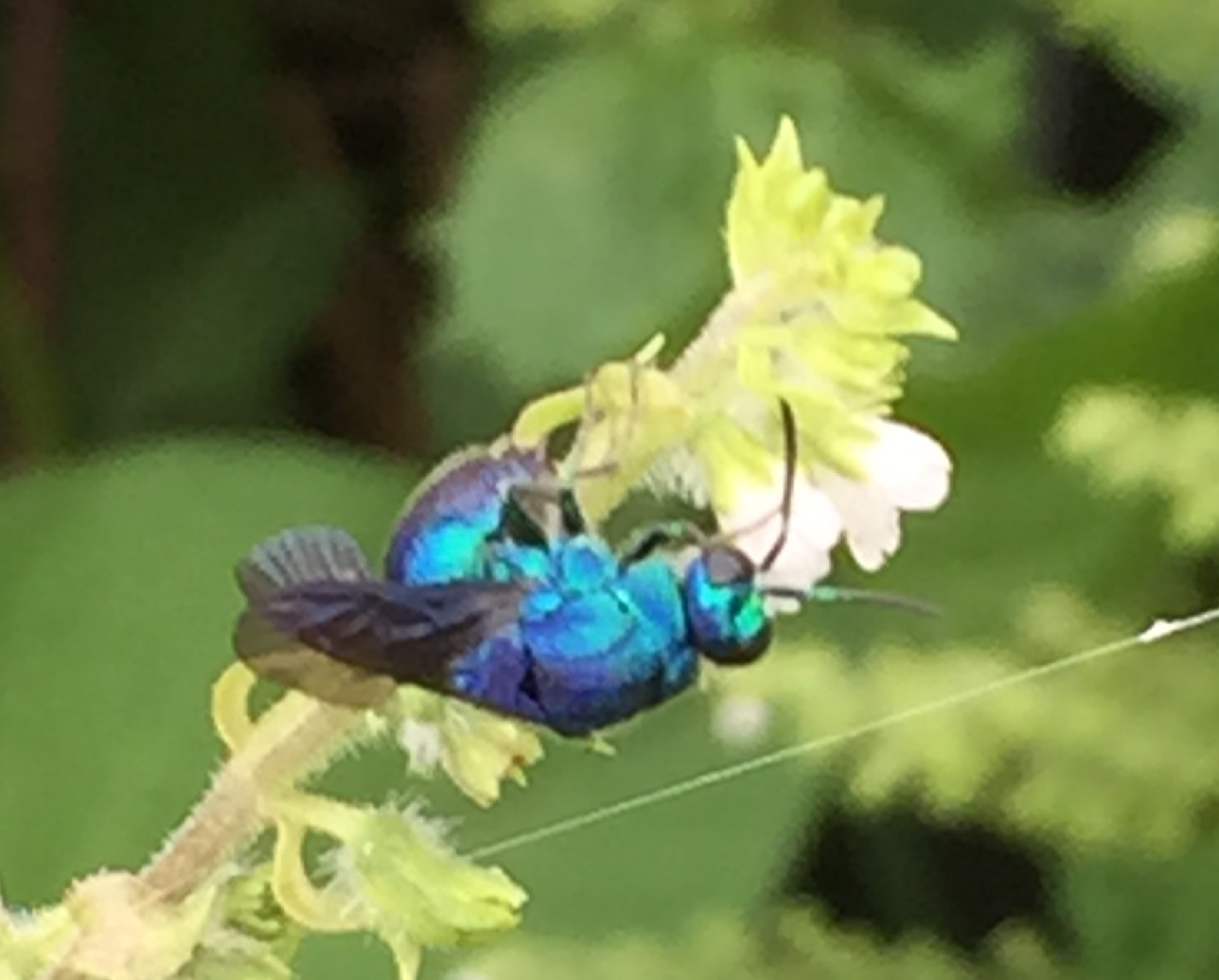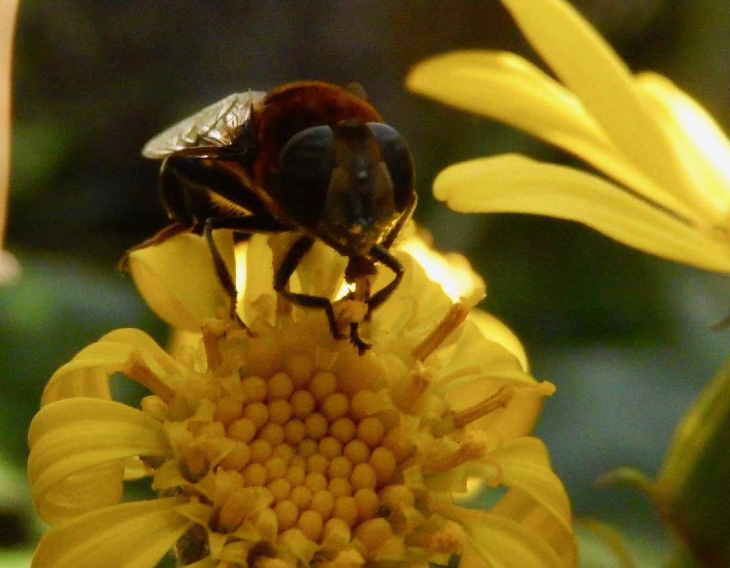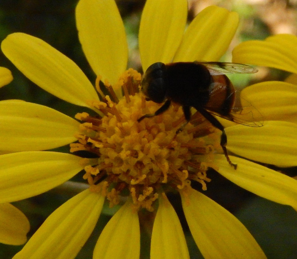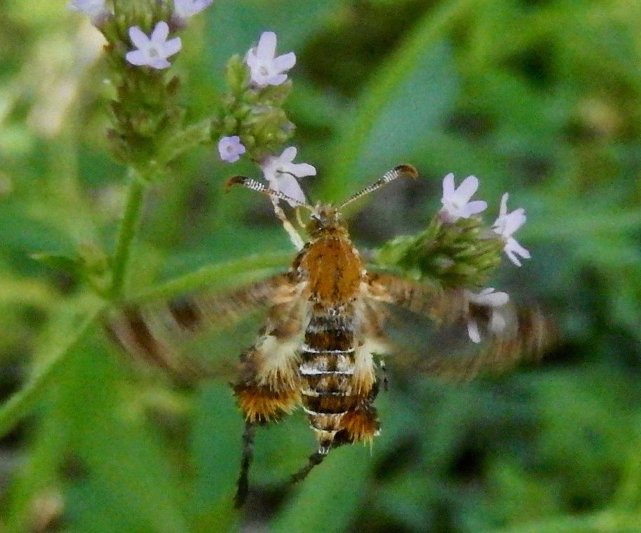 ホバリングしてアレチハナガサの蜜を吸っている所。飛びながら,毛のはえた後脚を動かす様子はハナバチそっくりです。