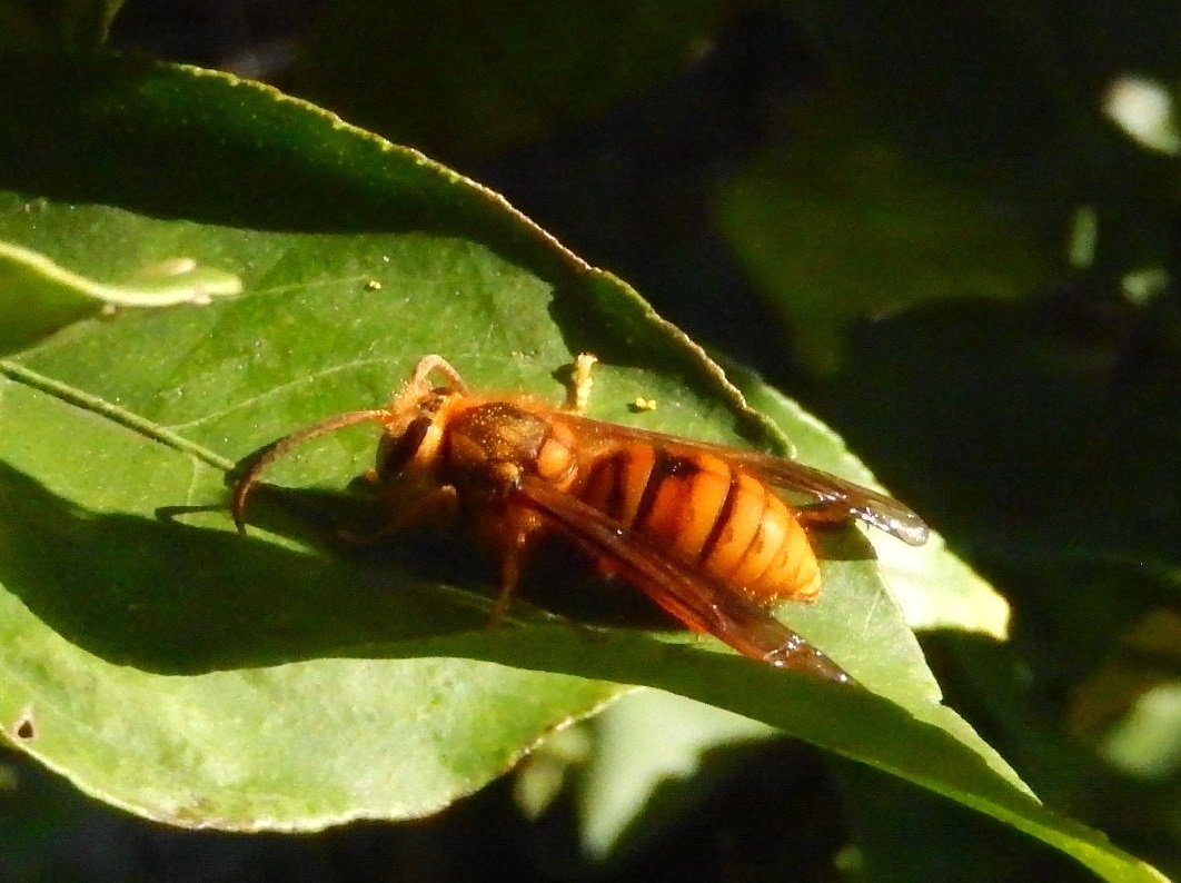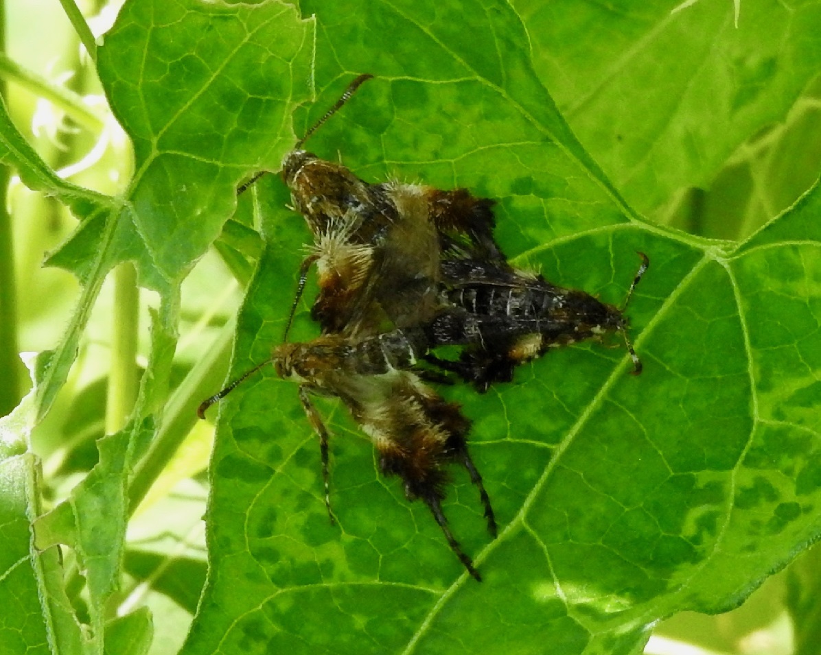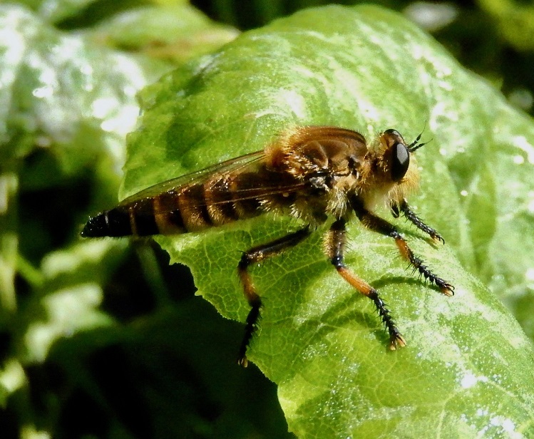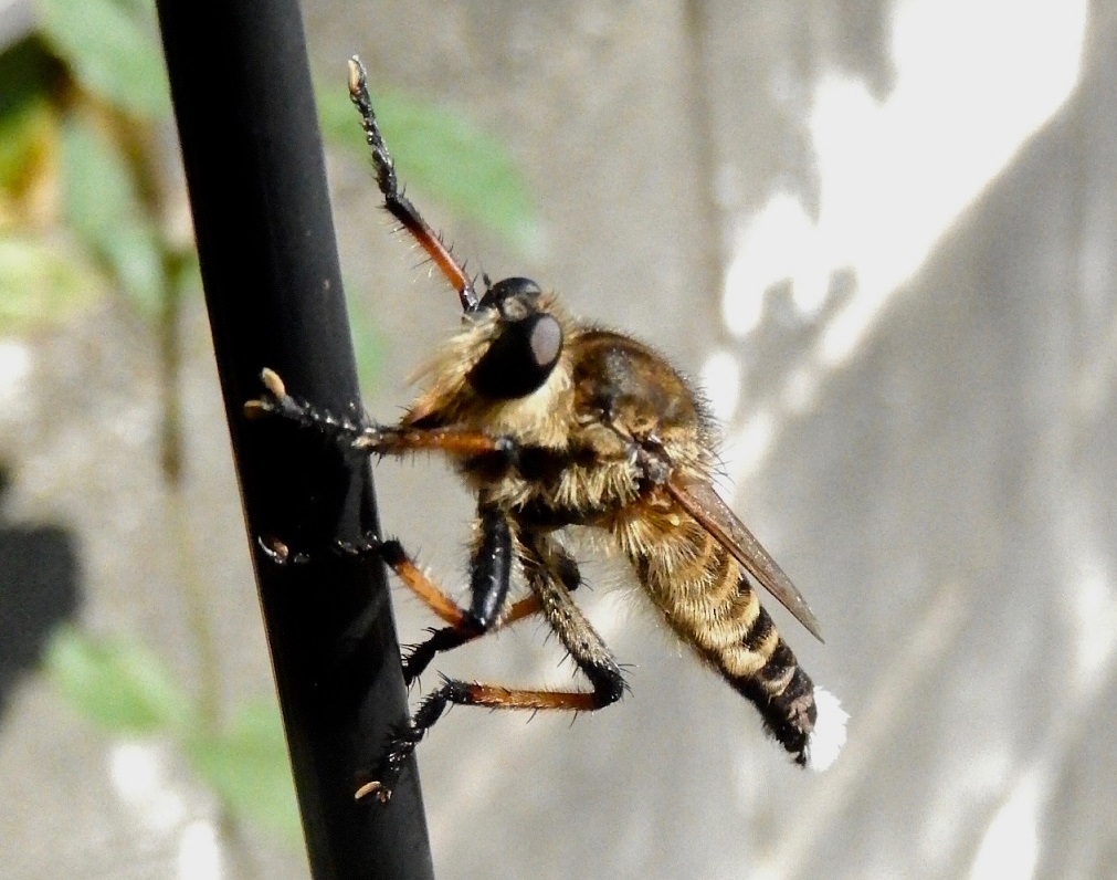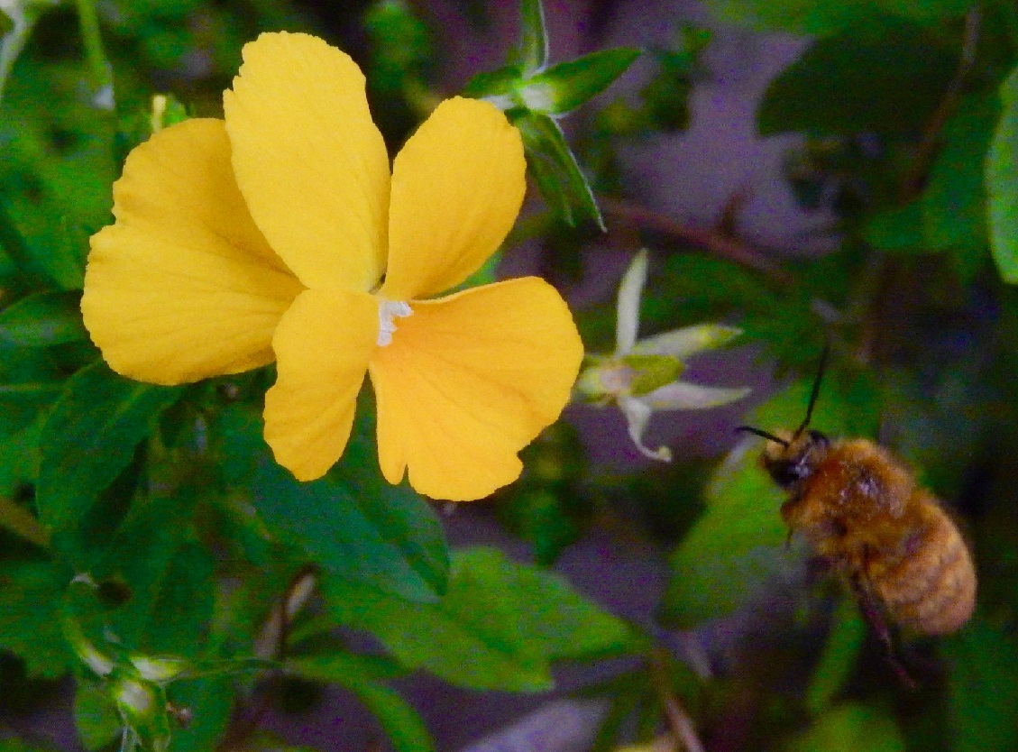 ホバリングしてアレチハナガサの蜜を吸っている所。飛びながら,毛のはえた後脚を動かす様子はハナバチそっくりです。