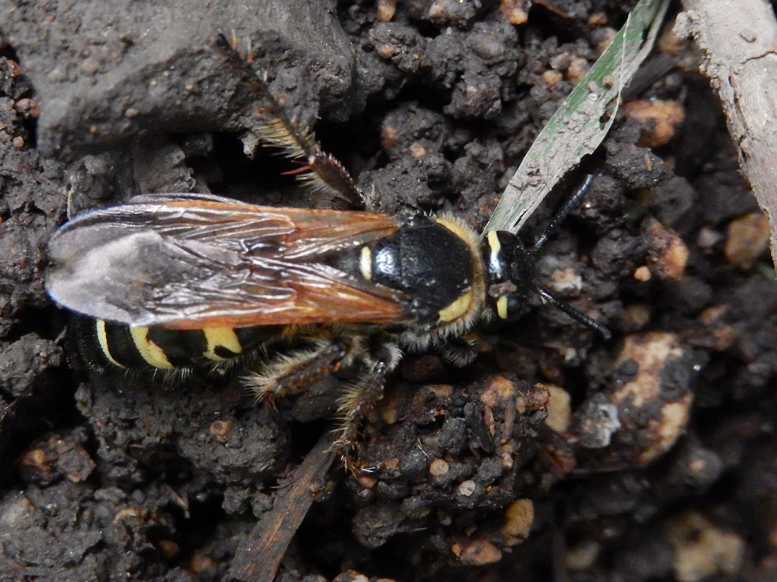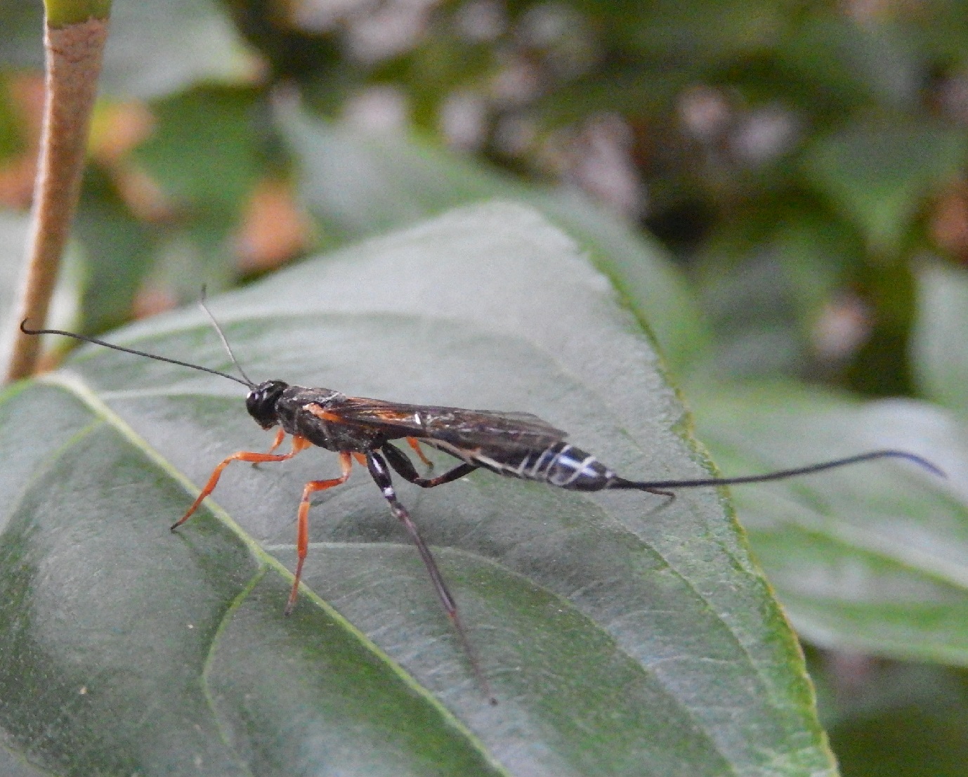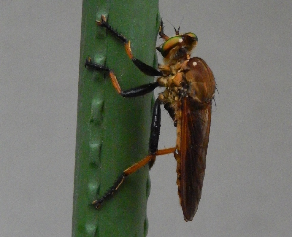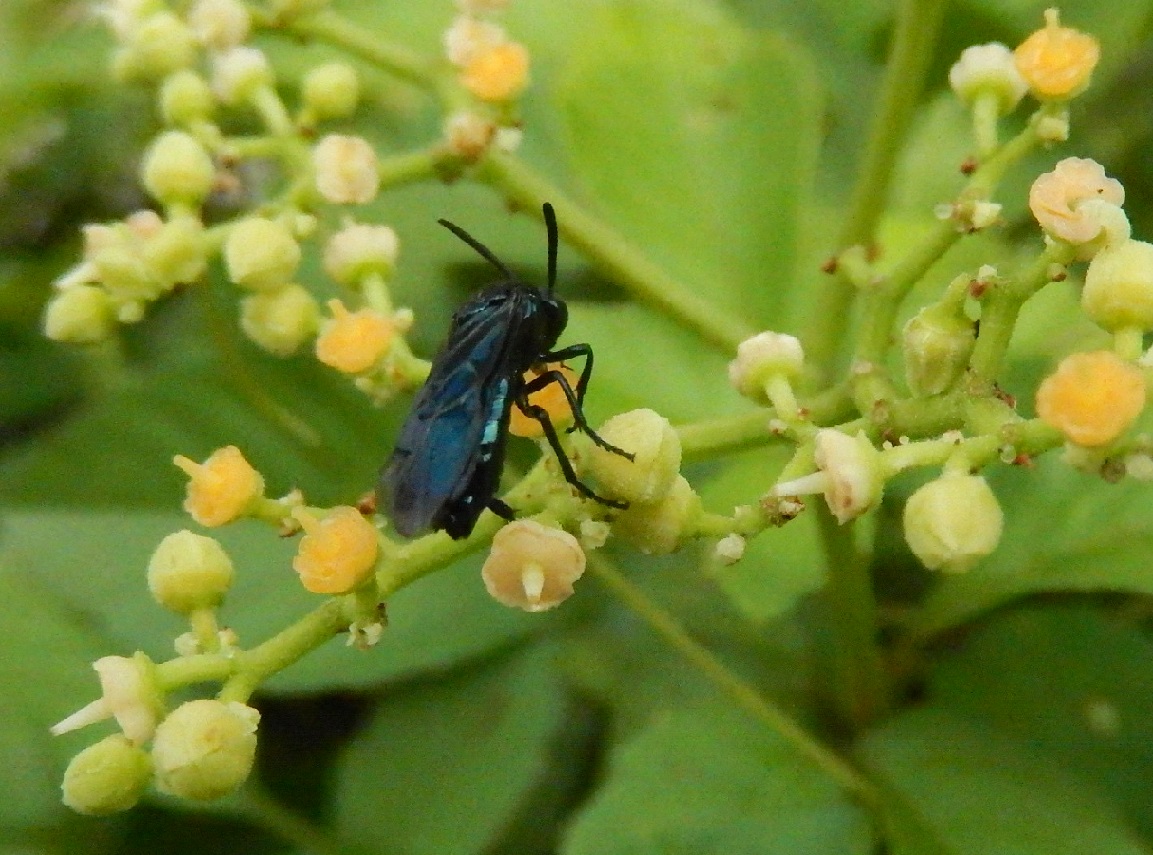 ホバリングしてアレチハナガサの蜜を吸っている所。飛びながら,毛のはえた後脚を動かす様子はハナバチそっくりです。