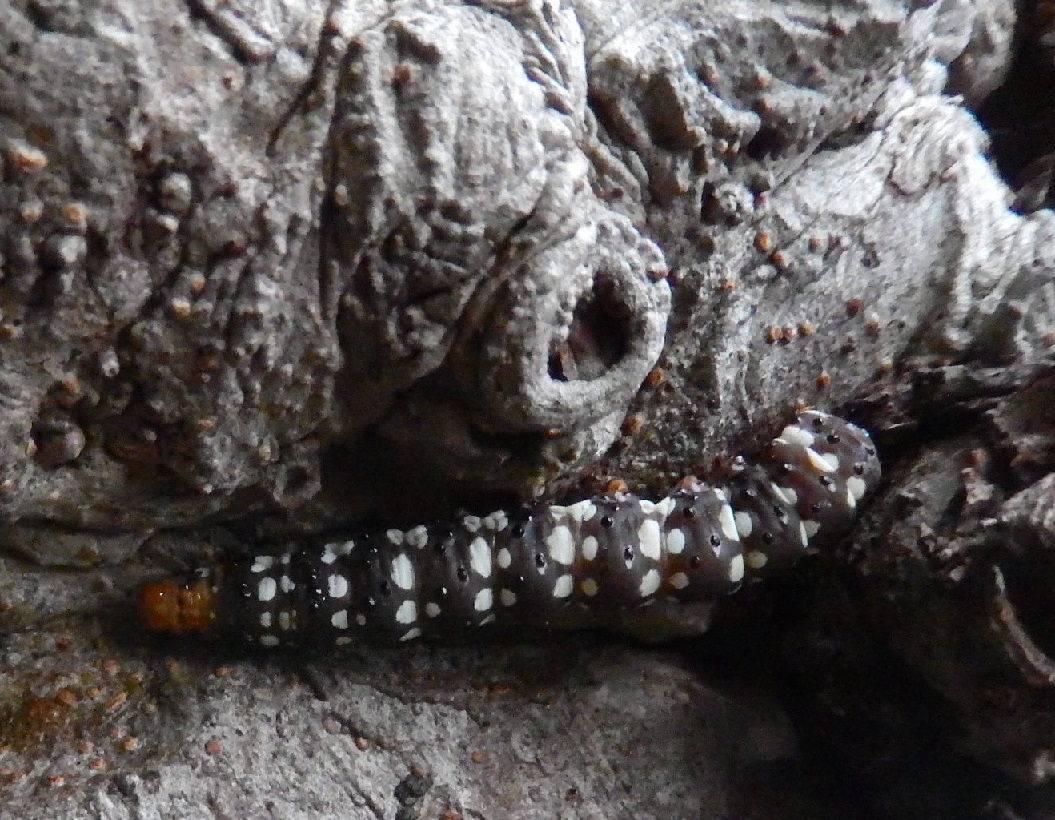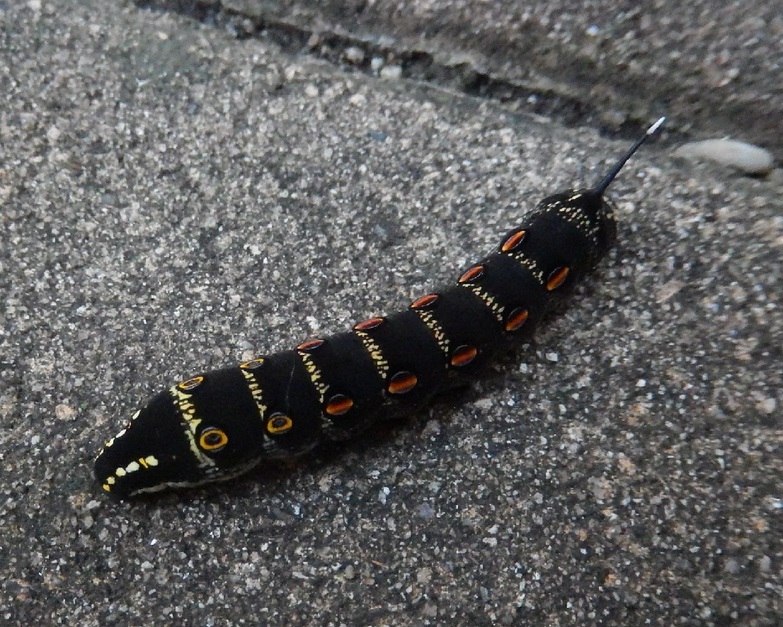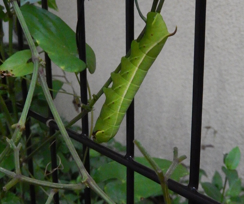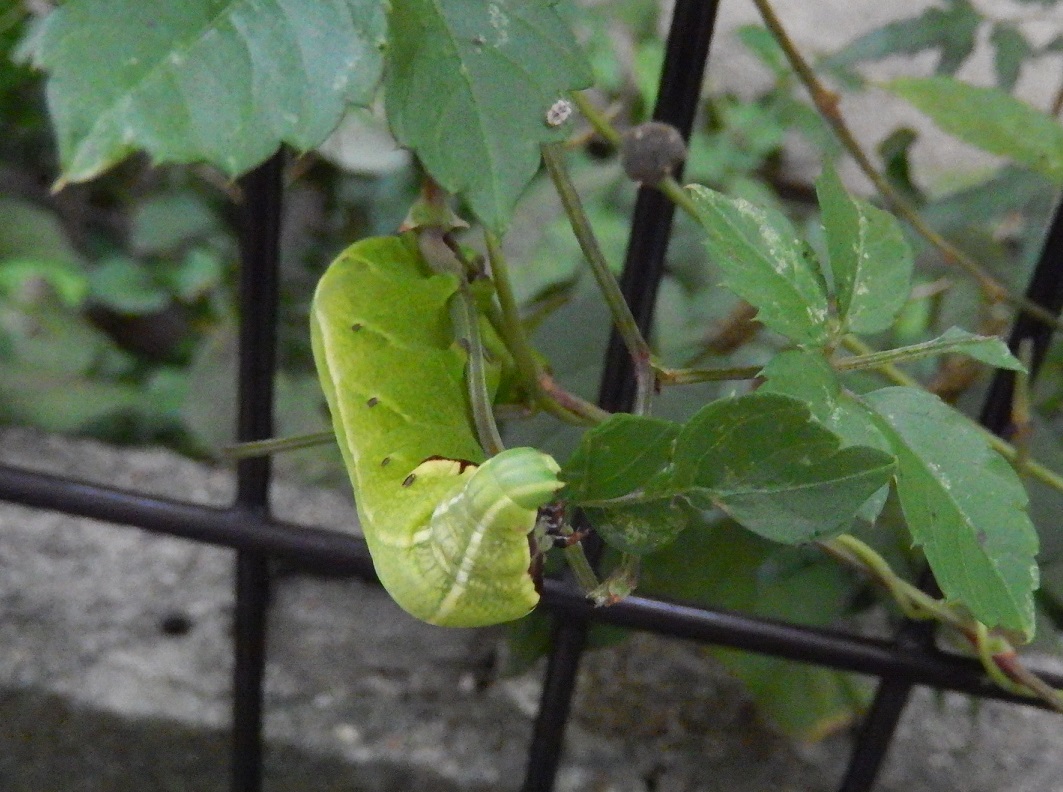 スズメガの仲間の幼虫はイモムシの代表のような雰囲気です。音に驚いて,顔を縮めてしばらくは動きませんでした。
