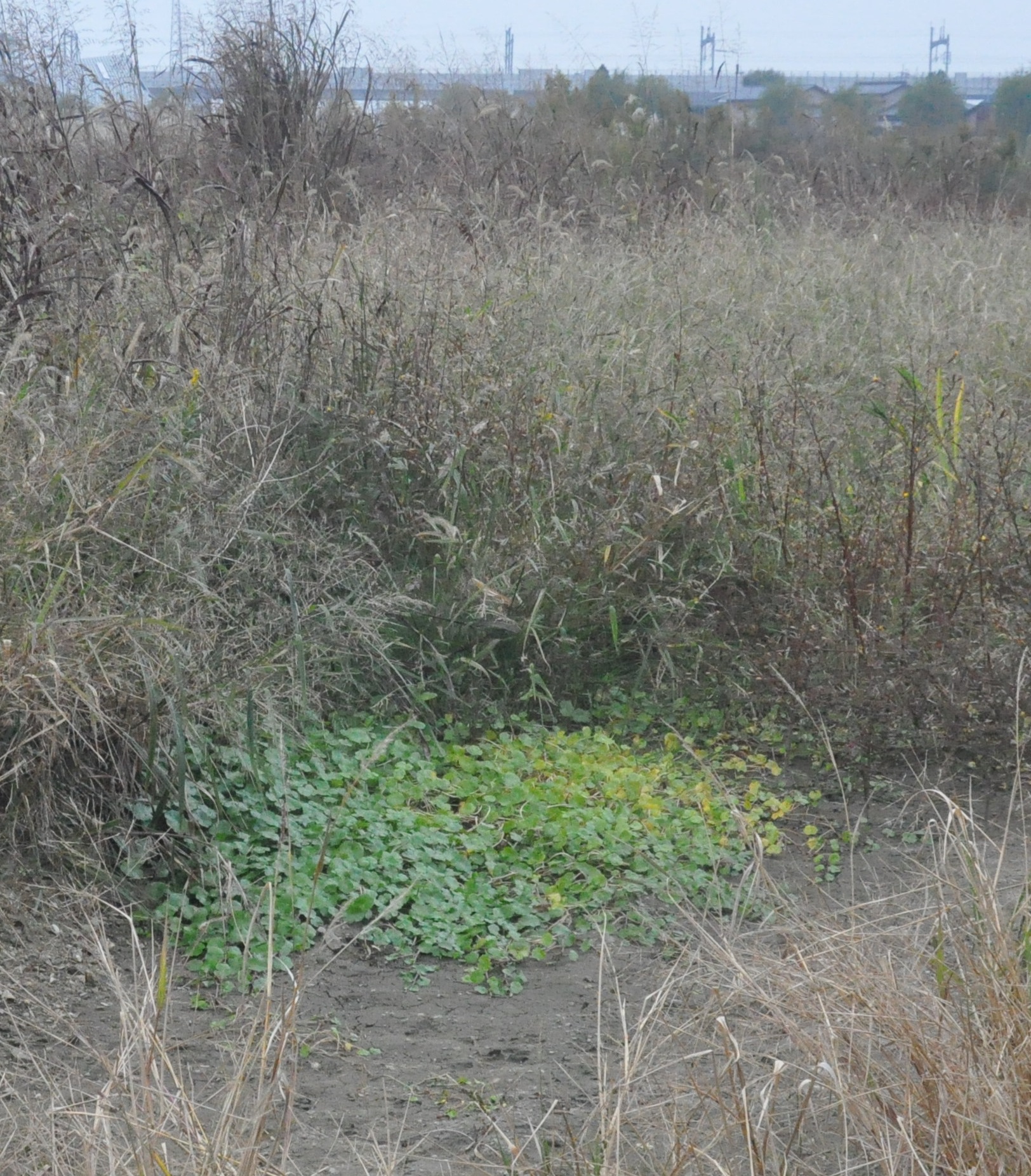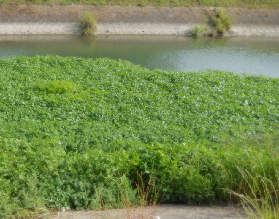最初にブラジルチドメグサの花が発見された場所の様子です。オオフサモやミゾソバなども見えます。この場所は後日駆除活動が行われ,一応,駆除に成功したようです。