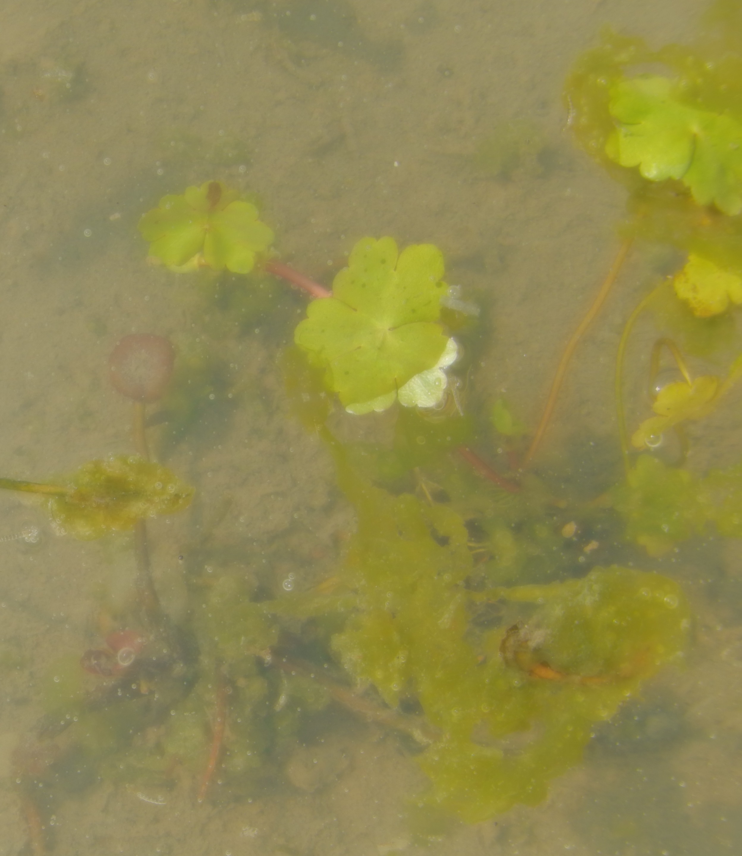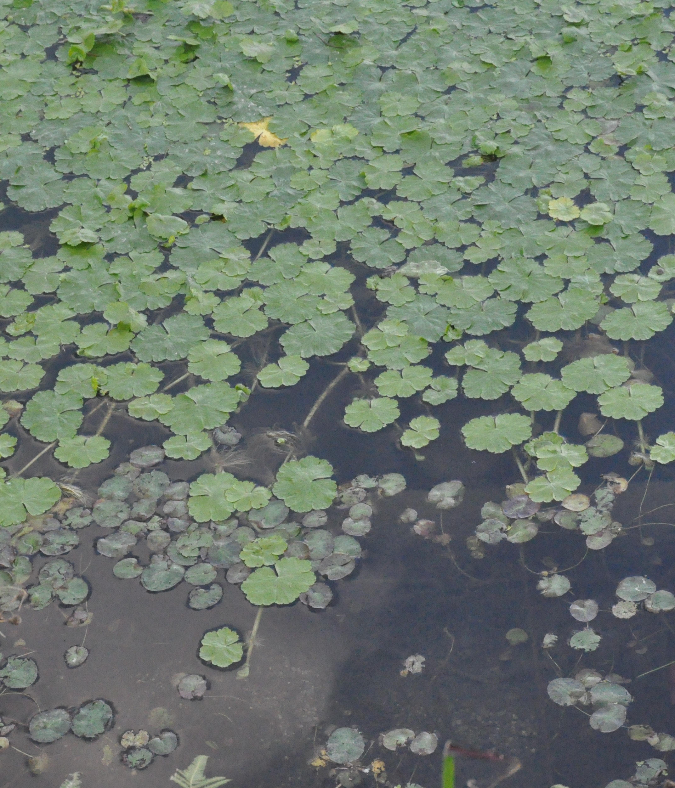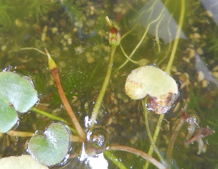 アサザの花期は春から秋とながいですが,ブラジルチドメグサの花期は4~6月とされています。ブラジルチドメグサの花は現場ではまだ観察されたことはないと思いますが,私たちは2014年周辺部の3ヶ所で確認しています。花茎は葉柄より短く花は葉に隠れるよう開花します。探す時は私たちの経験では,水上に展開した部分ではなく地上部とその隣接する部分を丁寧に探索すると発見できました。法律により持ち帰って継続観察はできませんので,これらの花や発達中の果実から繁殖可能な種子が形成されたかどうかは確認できていません。どうですかね。