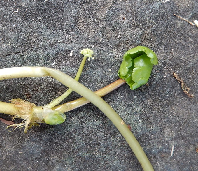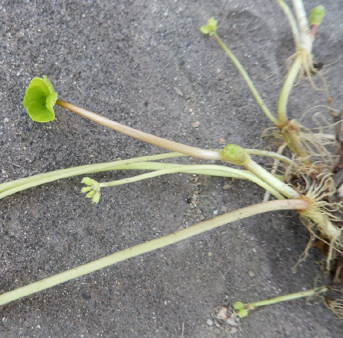 ブラジルチドメグサの栄養体は,節ごとに発根します。そのため,1節あれば繁殖可能とされています。さらに,現場での2018年の観察では,6月と12月に葉から発根しているのが発見されました。これが順調に成長するかどうかは確認できていませんが,条件が良ければ1葉からでも栄養生殖が可能なことを示唆しています。アサザも節から発根して分離して他の場所で繁殖することもありますが,その数はブラジルチドメグサに比べると比較にならない程少なく,また,漂着した場所にうまく土に根をおろさないと成長の継続が困難なようです。