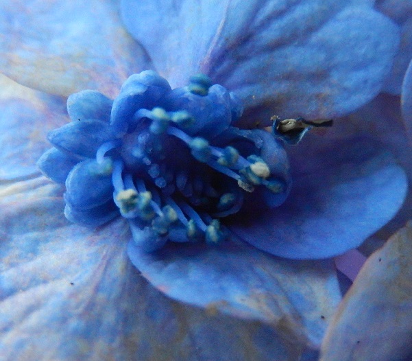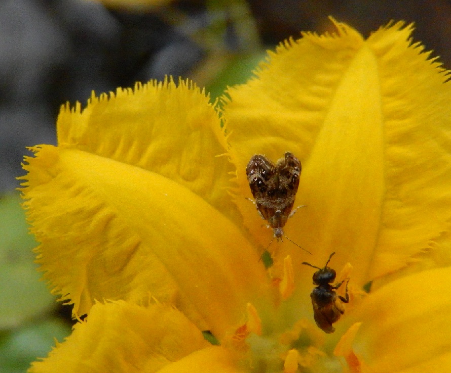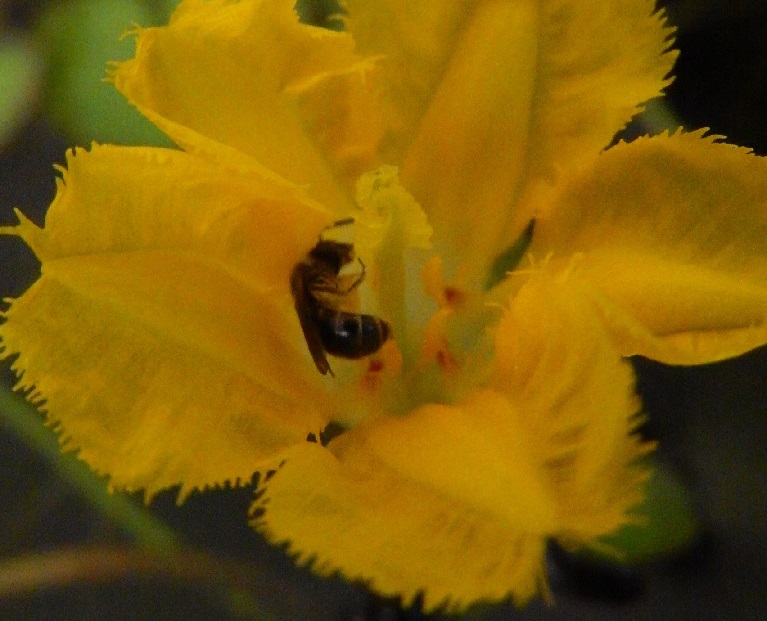 「幻のアサザを訪花した送粉者が,自宅のアサザにタッチ&ゴーのような短時間での受粉を起こすことはない。」ということをより確かなものにするためには,送粉者の行動を観察する必要があります。今まで,自宅で観察した送粉者は,鱗翅目・膜翅目及び双翅目です。この中で種名がわかるのはヤマトシジミくらいです。一番多く訪花するのはハナバチの仲間です。彼らは花の中を精力的に動きまわり蜜?と花粉を集めます。写真は長花柱花型を訪れたハナバチの仲間ですが,「どうして長花柱花型の花は受粉をするの?」という疑問に行動で答えを教えてくれました。彼らはめしべの花柱をまるで通路のように動きまわります。当然,花粉を柱頭につけることもあるでしょう。自家受精の起こる可能性も生じます。他の送粉者も,ハナバチの仲間のように花の中を縦横無尽に動きまわることはあまりありませんでしたが,比較的長時間花に留まっていました。これらの観察からも,タッチ&ゴーのような受粉は想定しづらいようです。