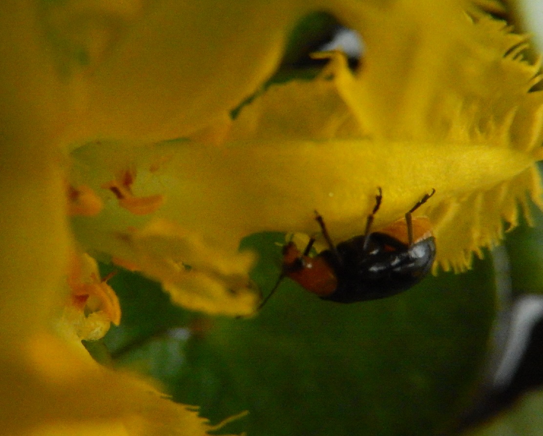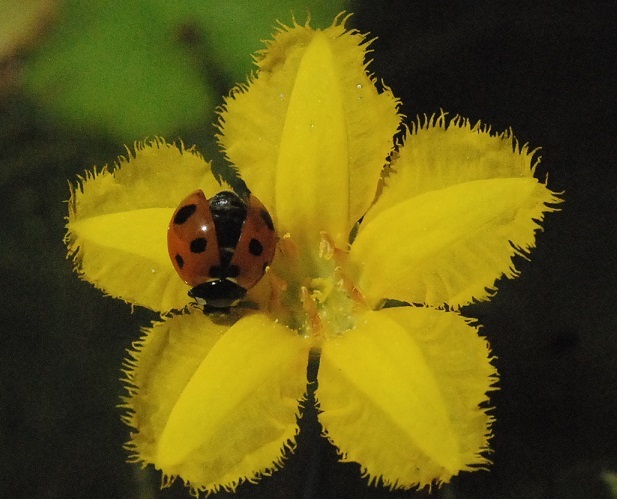 ナナホシテントウが花の上にいました。アサザの栽培容器では,たまにみかけます。何をしているかは不明です。