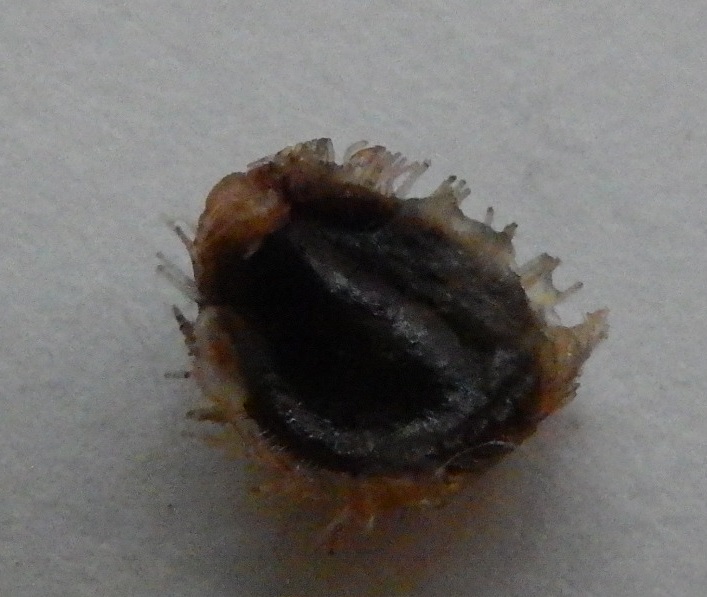 秋にもう一度チャンスをもらいたいと観察を続けていましたが,自宅の長花柱花型は花をつけませんでした。生育環境の改善を考える必要があります。しかし,10月,筑後市産のアサザに子房が良好に発達してきたものが1つだけ見つかりました。継続観察していると11月1日に子房が裂け種子が飛び出していました。父方はその当時唯一開花していた雑種第2代の短花柱花型だと考えられます。種子の内訳は成熟した種子3個と未成熟の種子(数えていないが十数個程度)でした。子房の形は左右相称なので,受精後しばらくは種子が良好に生育していたことが予想されます。しかし,多くの種子は初期発生に必要な成長因子が欠落しているため1㎜程度で発育を停止したのではないかと考えられます。