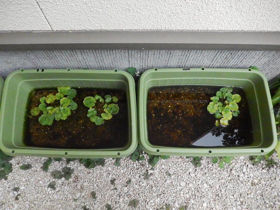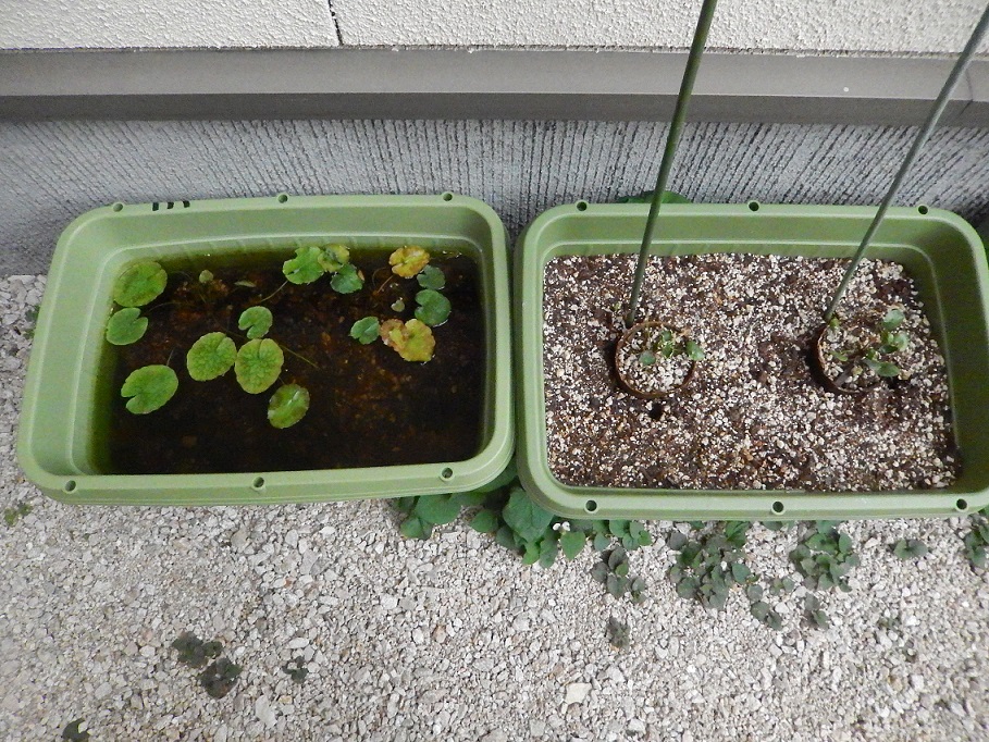 左がプランタ3です。右の株が成長が悪いのがわかります。右のプランタではアサザの陸での栽培を試みましたが失敗しました。