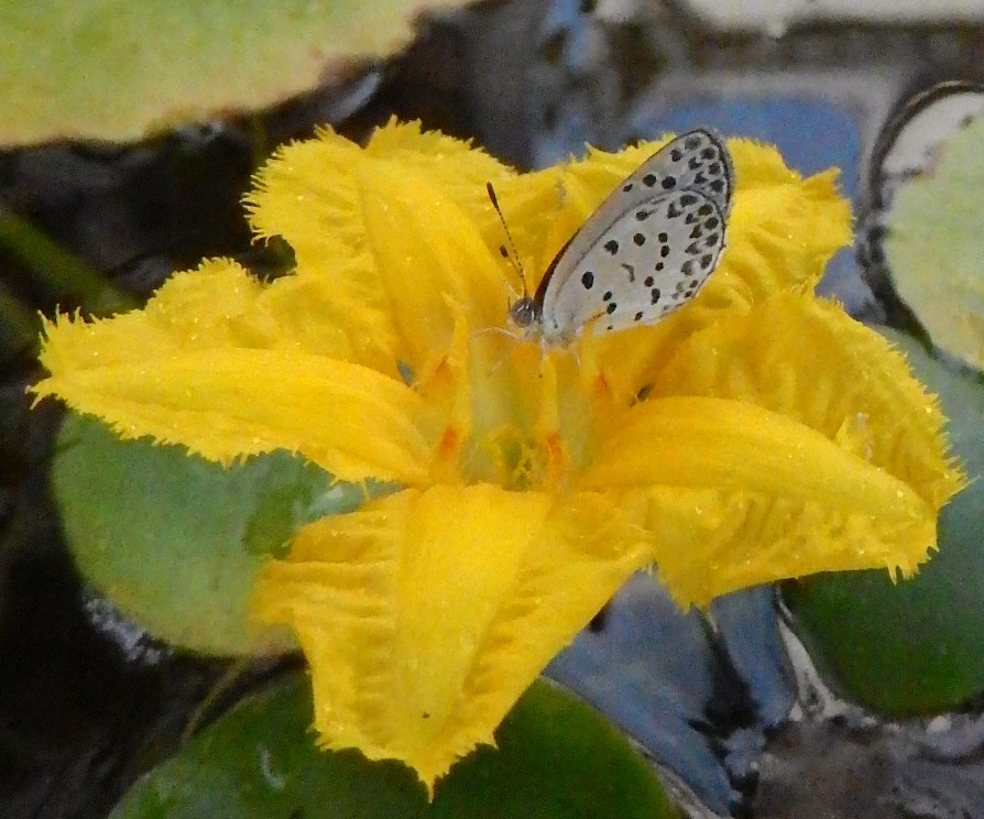 ヤマトシジミです。ヤマトシジミはたくさんいるのですが,アサザに吸蜜に訪れることはまれな気がします。