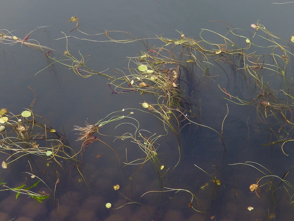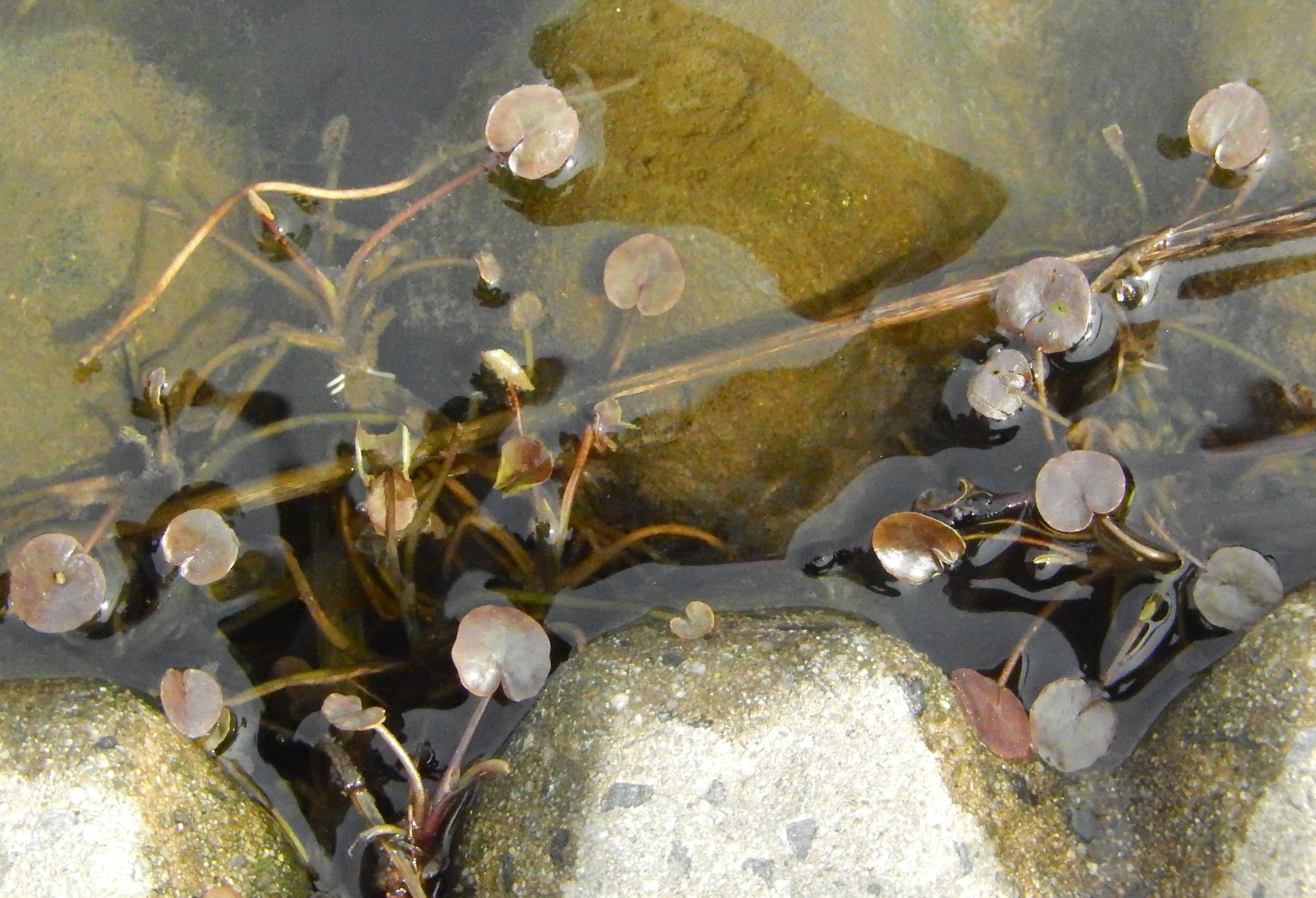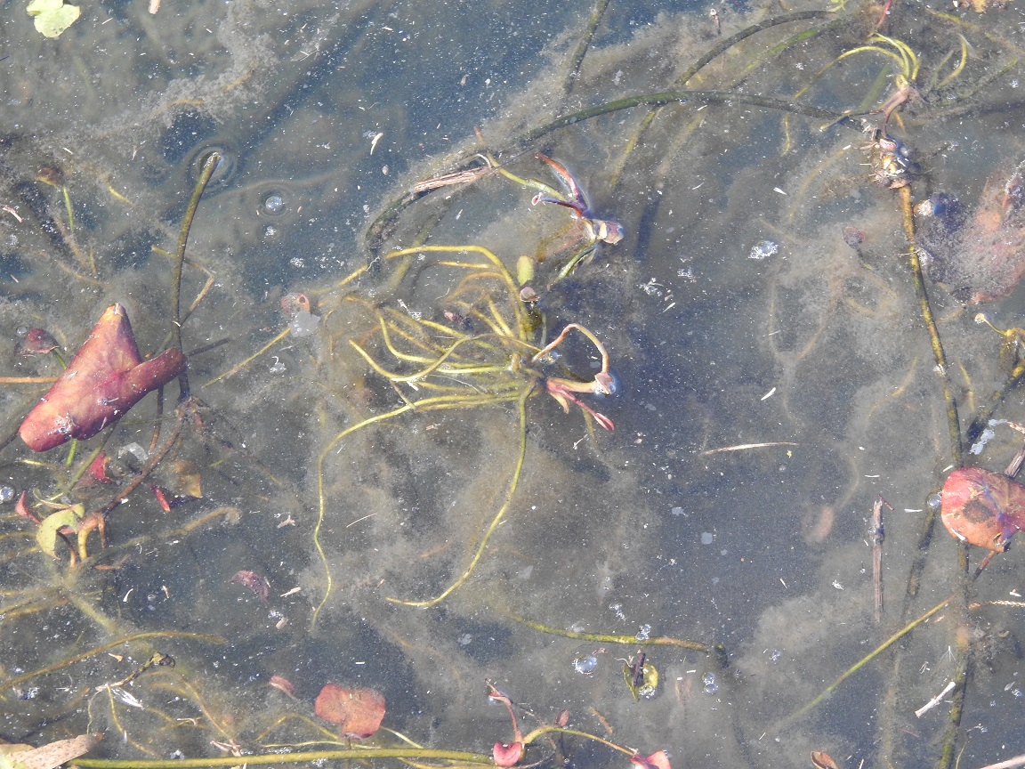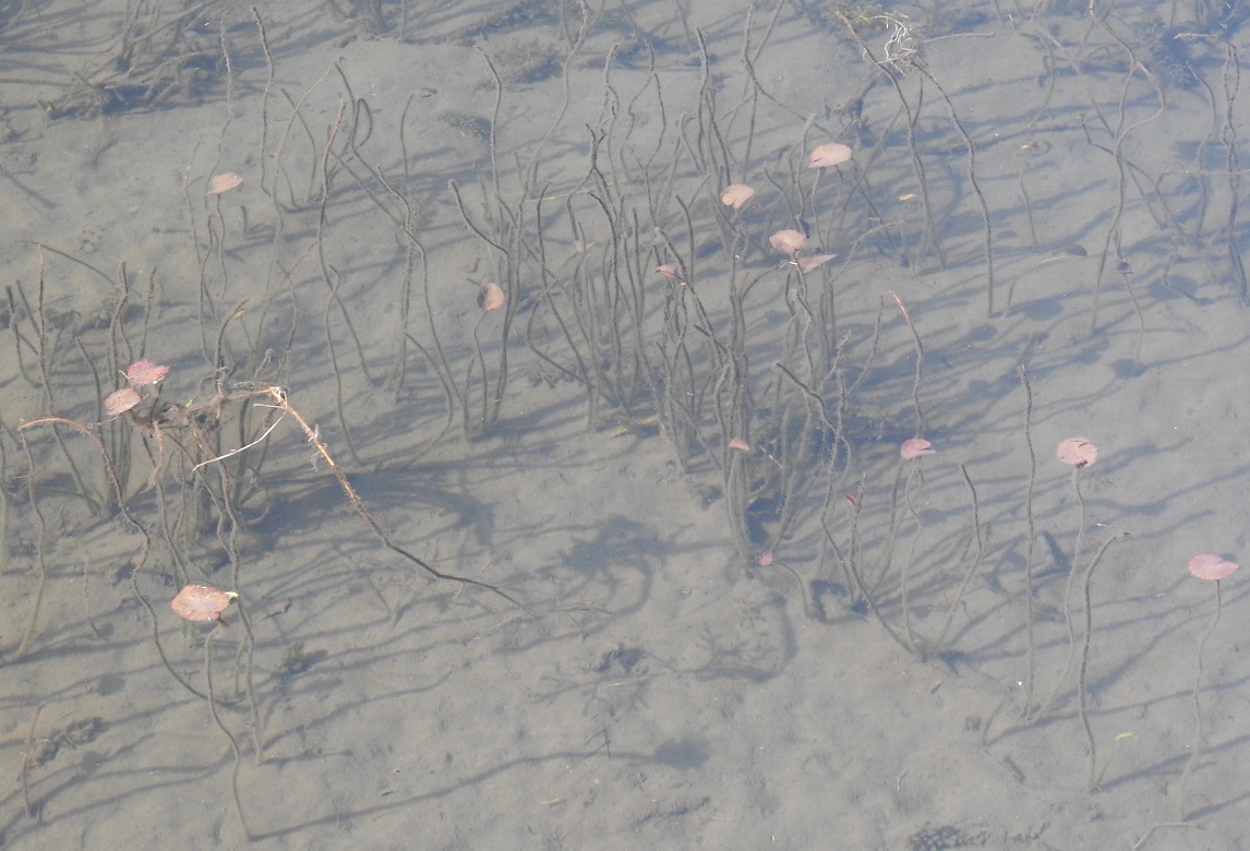 冬のアサザは浮葉がなくなり,春をまつ赤い小さな沈水葉のみになります。茎は大部分かれ,節の部分に根を形成しているのがよく見られます。場合によってはそれぞれが千切れて流れていきます。