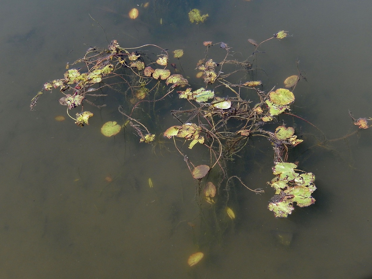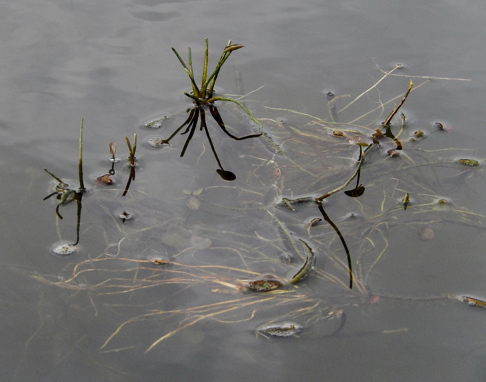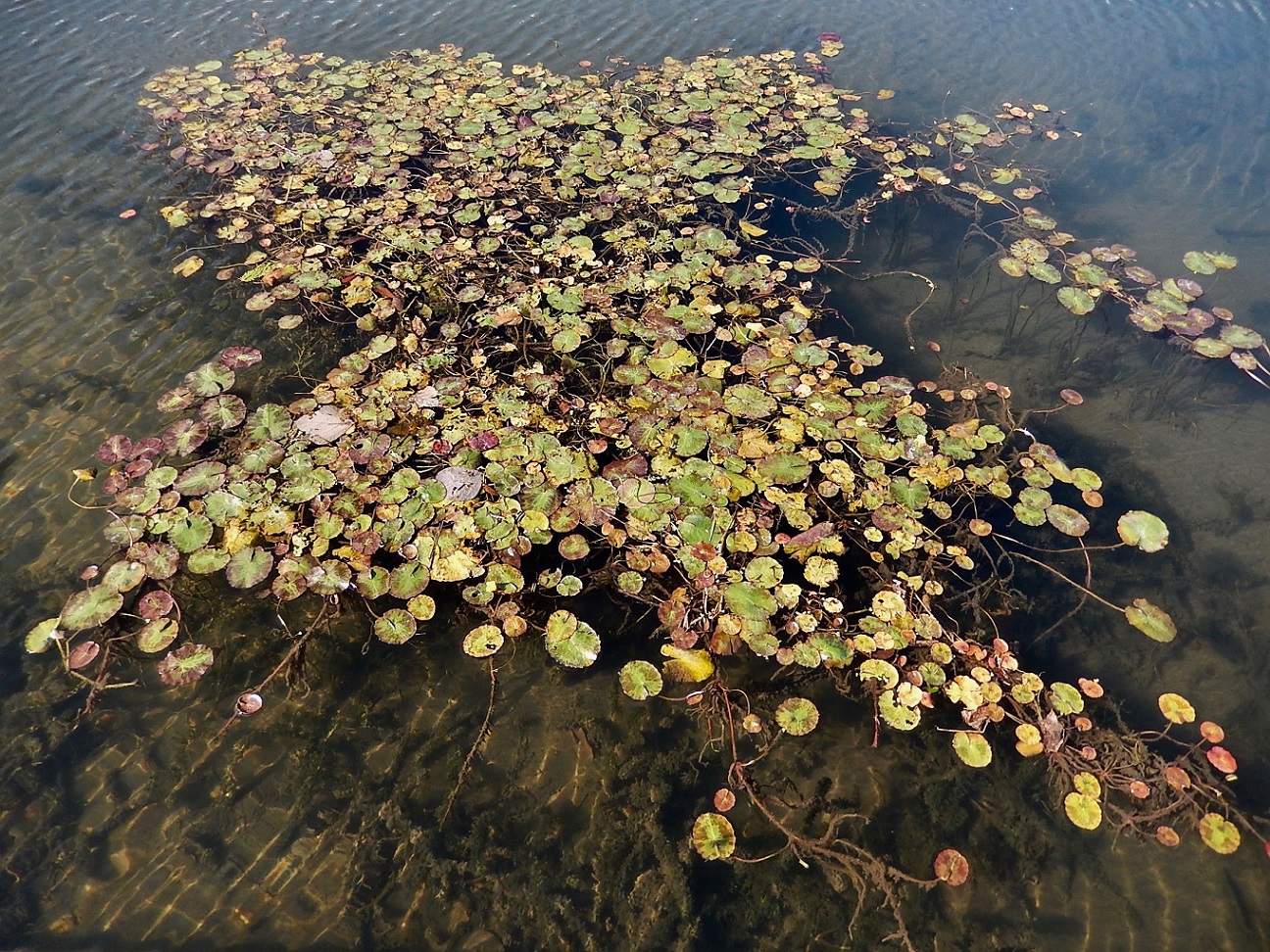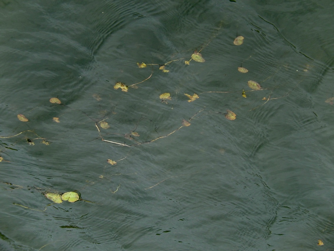 冬のアサザは浮葉がなくなり,春をまつ赤い小さな沈水葉のみになります。茎は大部分かれ,節の部分に根を形成しているのがよく見られます。場合によってはそれぞれが千切れて流れていきます。