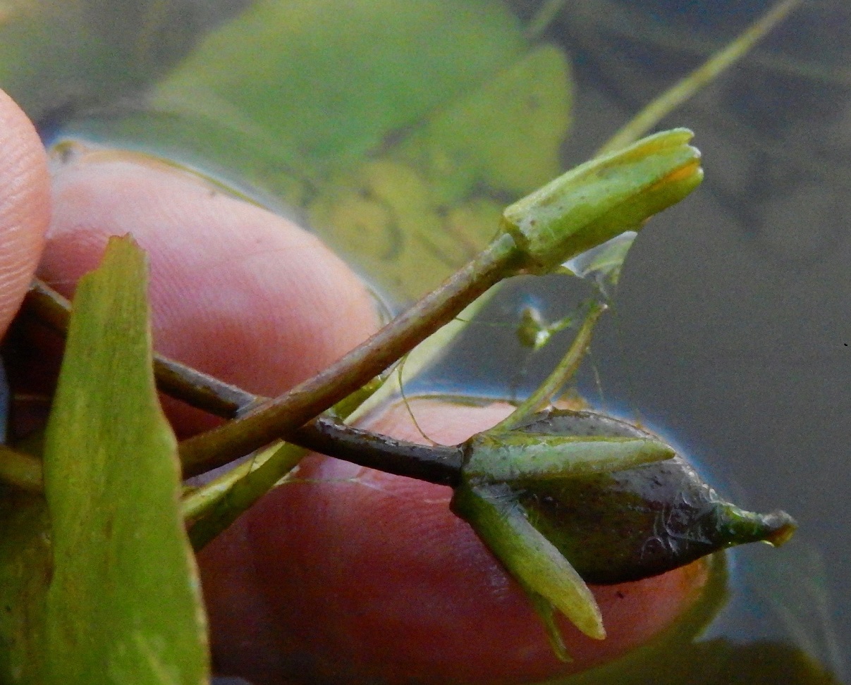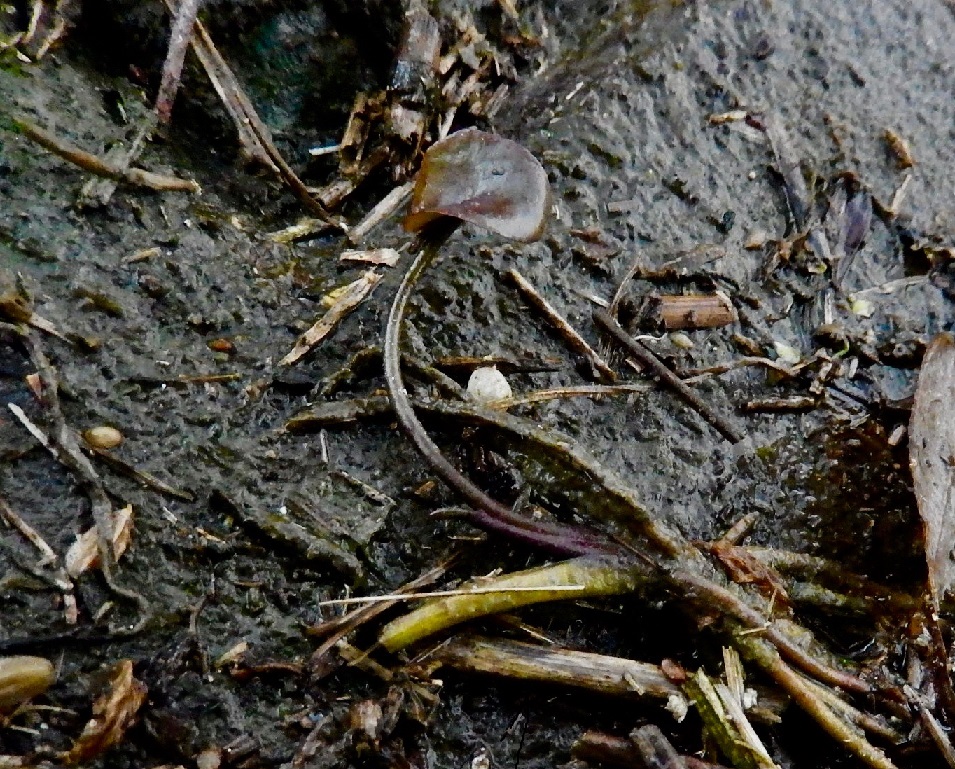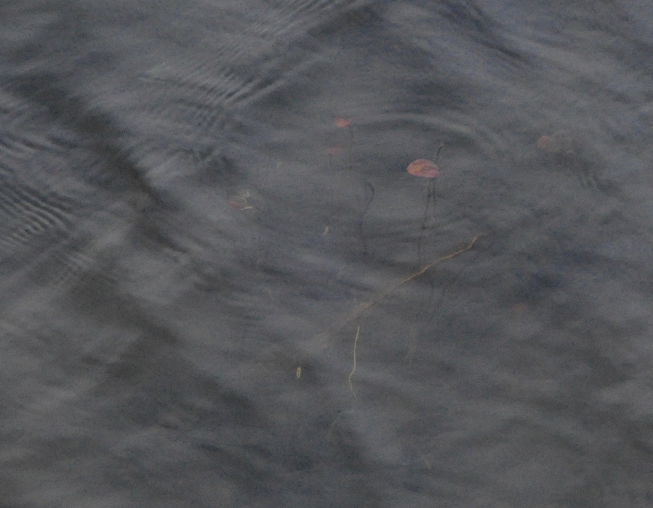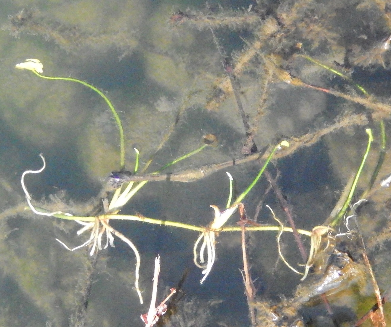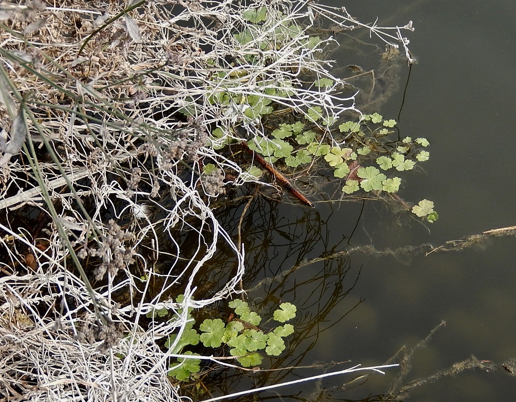 冬のアサザは浮葉がなくなり,春をまつ赤い小さな沈水葉のみになります。茎は大部分かれ,節の部分に根を形成しているのがよく見られます。場合によってはそれぞれが千切れて流れていきます。