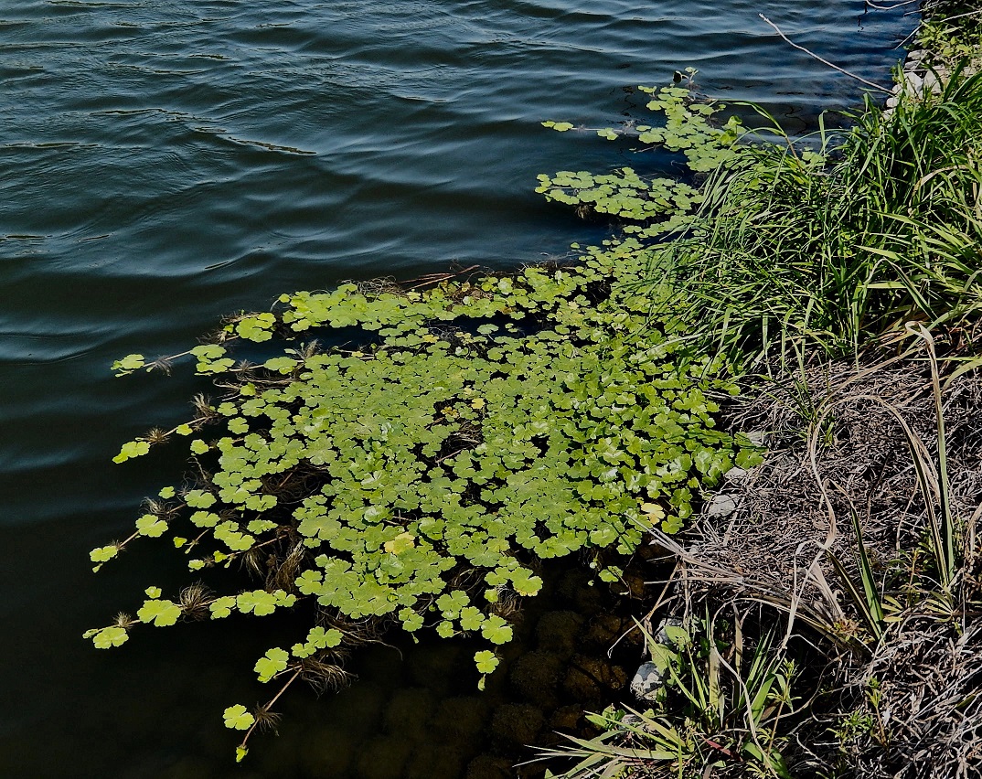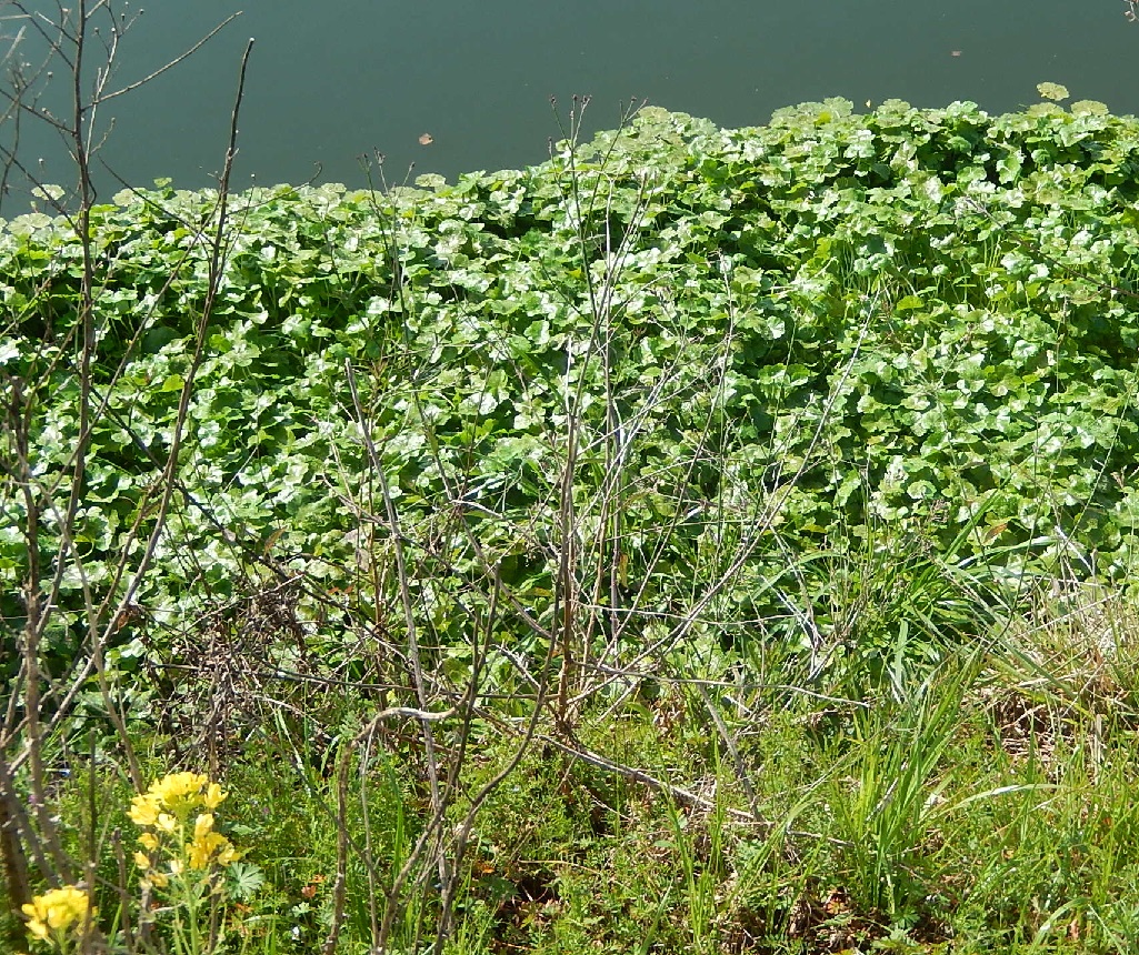 千間土居公園の対岸のブラジルチドメグサの繁殖の様子。写真水際の部分。調査ではなく,通過しただけでも大小の塊が複数確認できました。(八女市,2019年6月9日)