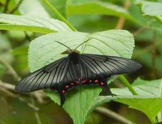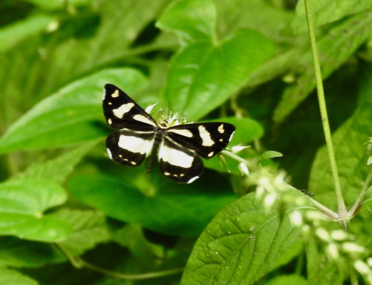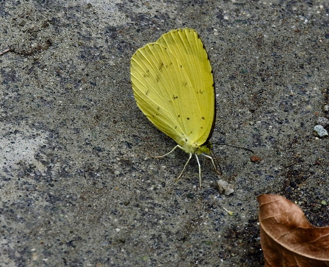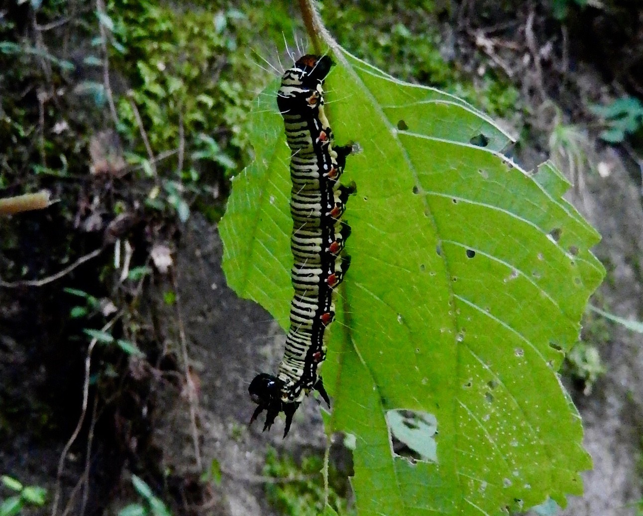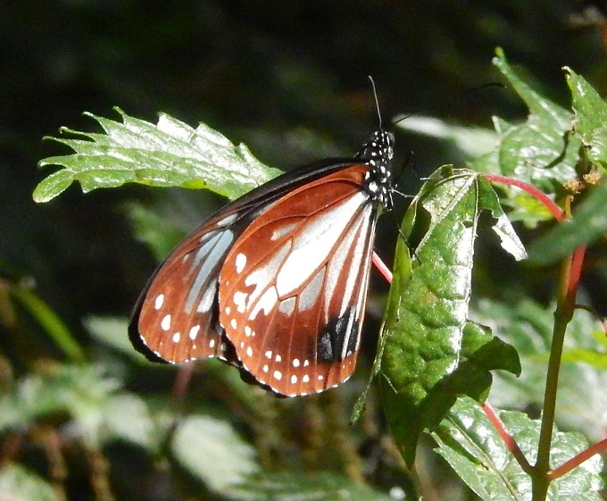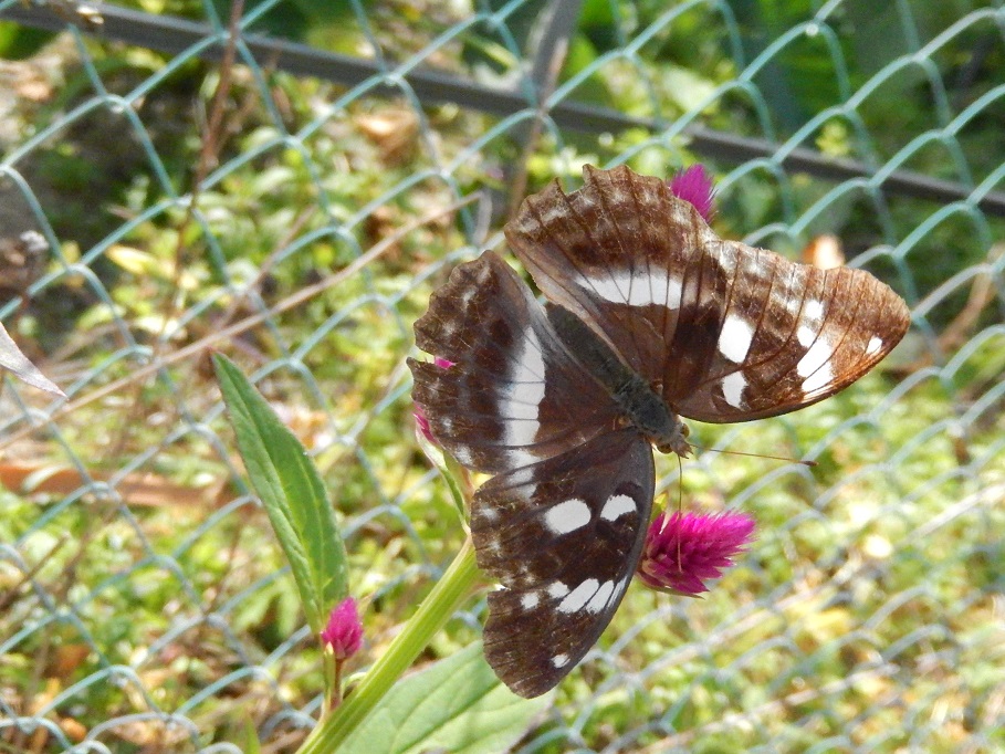 今回の観察会では,今年5月に紹介したキンモンガが何回も現れました。キンモンガは昼行性のガで花にも来るようです。そこで,話題になったのが,「チョウとガの違い」です。会員のひとりが,「チョウは・・・,ガは・・・・。しかし,結局,決定的な違いはないので,そのグループ(分類郡)を総合的に判断して,ガかチョウかを判断してどちらかに入れています。・・・」という主旨の説明をされていました。要するにチョウとかガというのは系統的な分類の単位ではないということです。チョウとガを区別する単語が存在しない言語も多数あるようです。今回はコミスジというチョウを比較のために掲載しました。コミスジは多くのガの仲間のように翅を広げたまま止まっていることが多いようです。写真の個体は残念ながら,羽化で何らかのトラブルがあったようで,後翅は十分に伸びきれなかったようです。