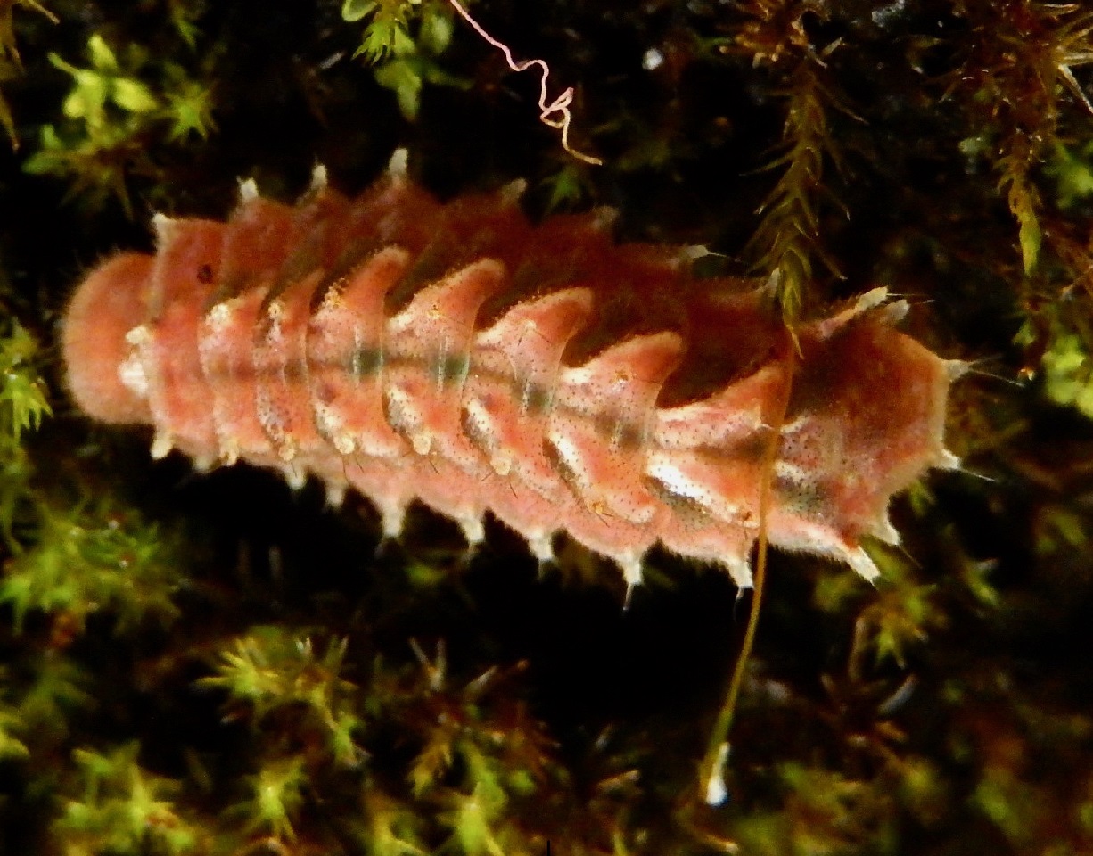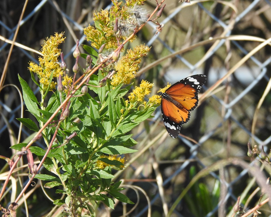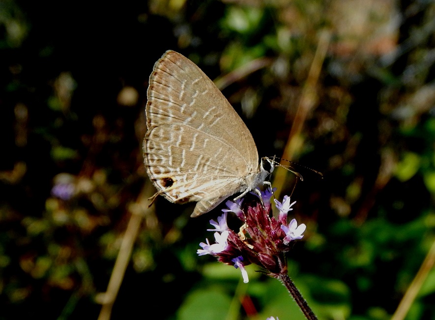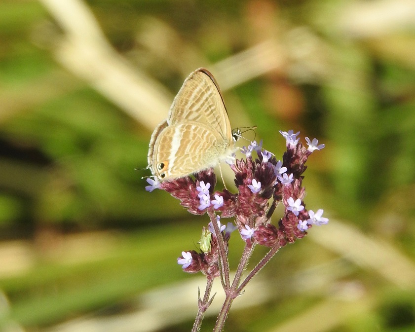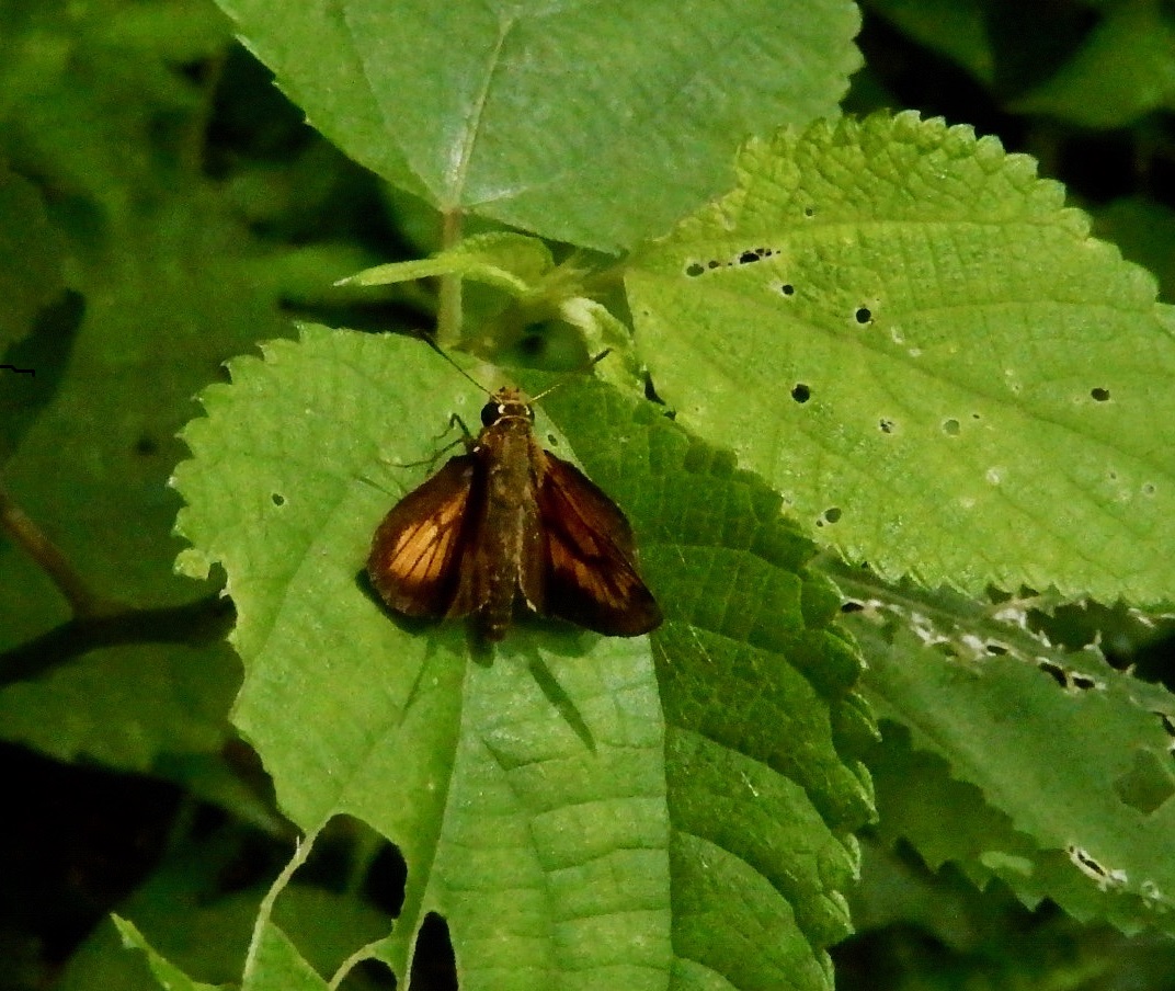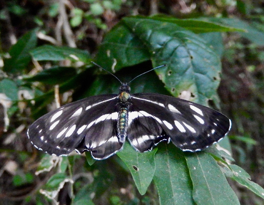 今回の観察会では,今年5月に紹介したキンモンガが何回も現れました。キンモンガは昼行性のガで花にも来るようです。そこで,話題になったのが,「チョウとガの違い」です。会員のひとりが,「チョウは・・・,ガは・・・・。しかし,結局,決定的な違いはないので,そのグループ(分類郡)を総合的に判断して,ガかチョウかを判断してどちらかに入れています。・・・」という主旨の説明をされていました。要するにチョウとかガというのは系統的な分類の単位ではないということです。チョウとガを区別する単語が存在しない言語も多数あるようです。今回はコミスジというチョウを比較のために掲載しました。コミスジは多くのガの仲間のように翅を広げたまま止まっていることが多いようです。写真の個体は残念ながら,羽化で何らかのトラブルがあったようで,後翅は十分に伸びきれなかったようです。