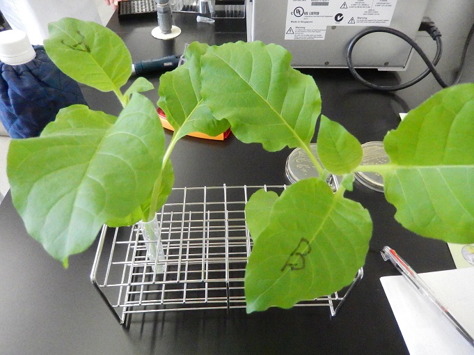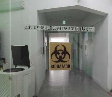 最後は,岡山県農林総合センターです。バイオハザードのマークを初めてみたような気がします。研修の内容は主にバイオテクノロジーでしたが,最も印象に残ったのが遺伝子組み替えの古典的な実験,「ホタルのルシフェラーゼの遺伝子をタバコに導入する実験」でした。やったのは,極めて単純で,予め用意していただいた遺伝子組み換えと非組み換えのタバコ苗をそれぞれ一人一株ずつ暗室に持ち込みじっと待って目を慣らすだけです。何でも遺伝子は,ホタル由来