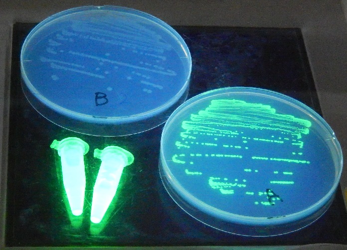 Aは大腸菌にGFP遺伝子を導入したもの。