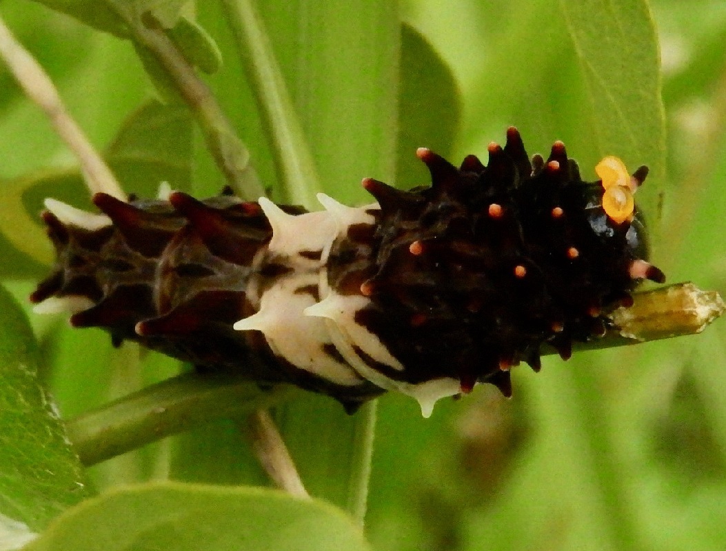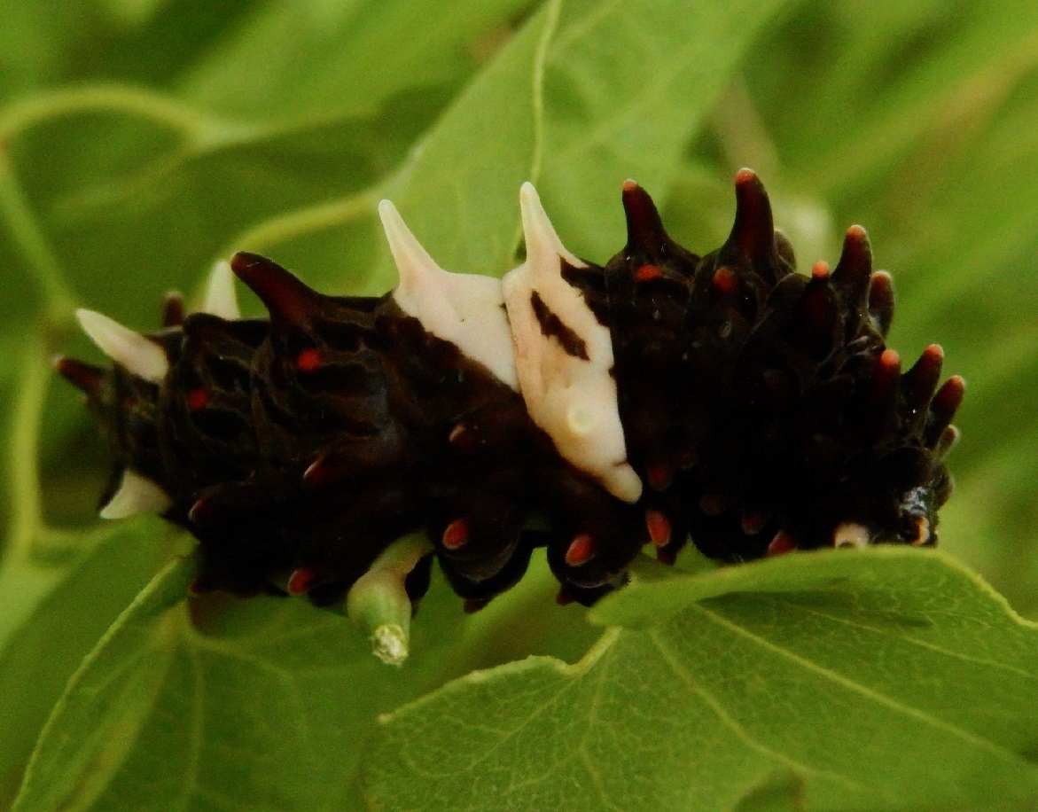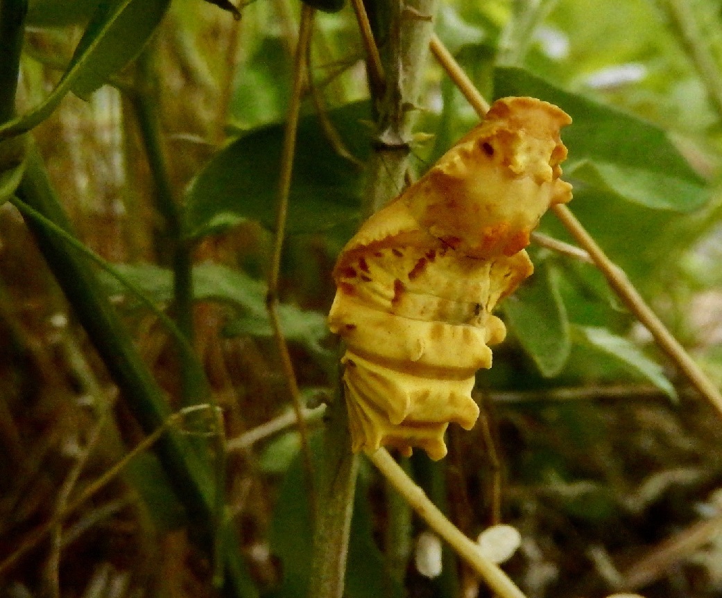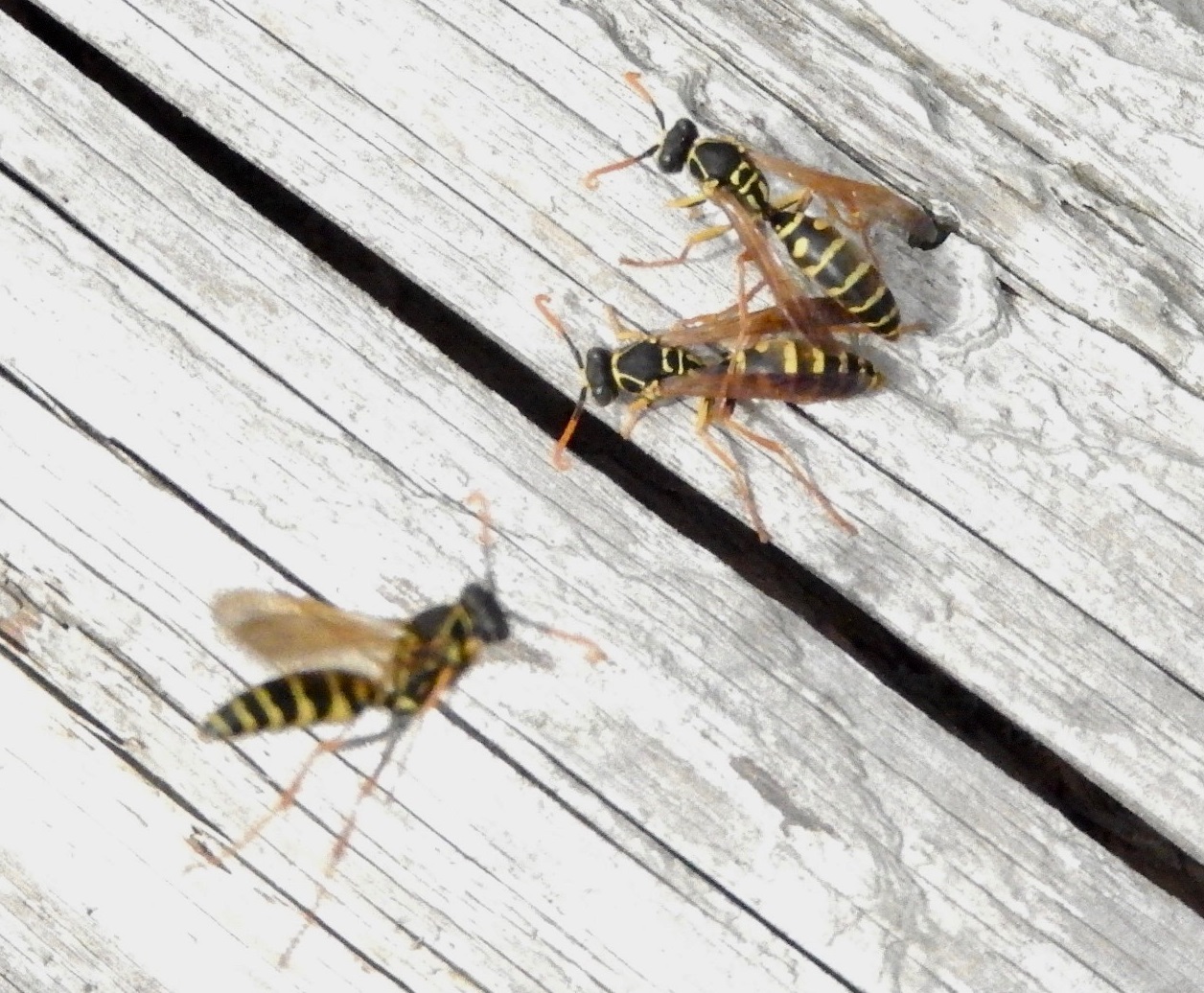 道中いたる所に「フタモンアシナガバチ」が群れていました。どうせ雄だろうと思い,近づいて写真をとりました。ハチの毒針は産卵管が変化したものなので,当然雄にはありません。観察していると盛んに集まってくる感じです。何をしているのだろうとネットで検索すると,誤認交尾らしいです。誤認交尾とは,あぶれ雄が他の雄に交尾のまねごとをする行為です。雌雄の違いを検索すると,雄は顔面(頭楯)が黄色い仮面のようになること,触角の先端がカールするように丸くなることが記載されていました。残念ながら,顔を正面から撮影したものはありませんでしたが,触角の形状から全て雄であることが判明しました。秋のもの悲しい風景です。