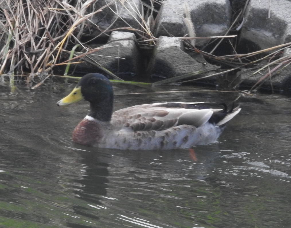 カルガモの群れの中に混じって行動していました。血縁があるかどうかは不明です。
